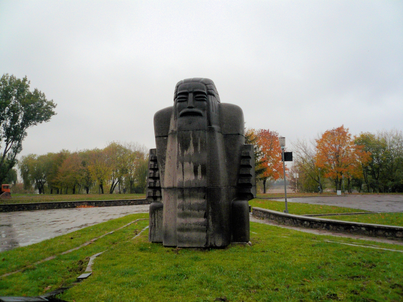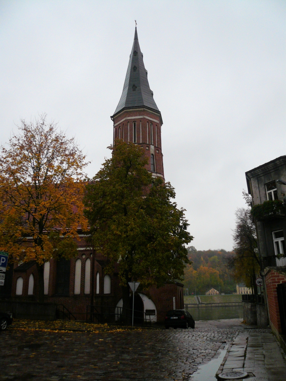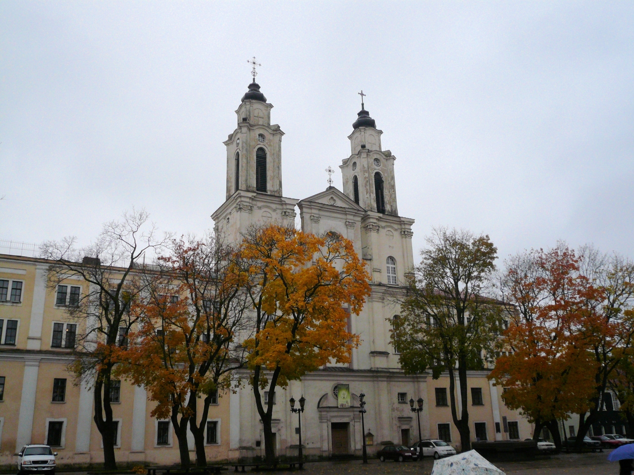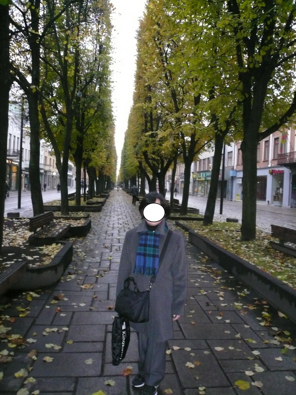 8:40にホテル近くの散策に出た。カウナス旧市街の東、小雨がぱらつく、寒い朝でしたが、重々しい聖ミカエル大聖堂傍の樫の木広場を通り、大聖堂から一直線に伸びる菩提樹の並木道をしばし歩いた。黄葉した落ち葉が小雨に濡れて、冬の到来を暗示していた。(~9:10)