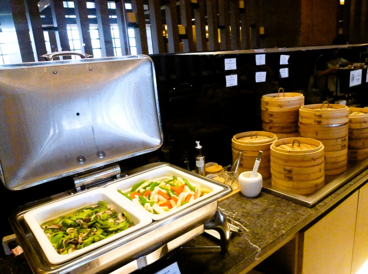 <VIPラウンジ>ですが、空港内(ex羽田空港)ではなく、街の様子が見えました/キッチンはベジタリアン用野菜が多め/様々の具入り小籠包(街の小籠包専門店は台風で休業)で、美味しく頂きました☆