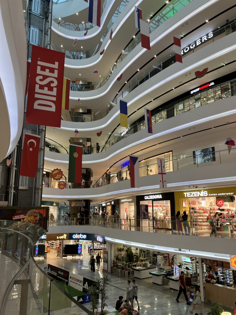 スカンデルベグ広場の隣にある新しいショッピングモールです。6、7階建てで中は既視感があります。吹き抜けは曲線で、エレベーターやエスカレーターもなんとなく見たような。◯◯◯モールと似ています。