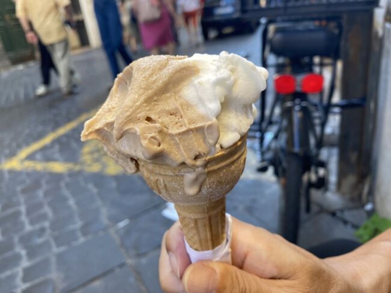 スペイン広場近くの店舗では、向かい側に安いパスタの持ち帰り店もあるので、周辺の路上はパスタやティラミスを立って食べる人でいっぱいでした。私達は近くの広場で座って食べました。