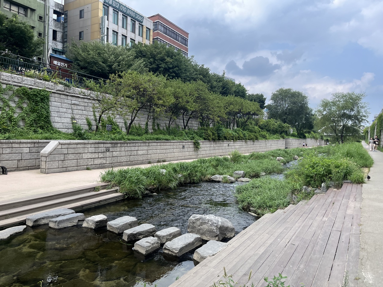 都会に流れる清流と新緑、札幌の中心部を流れる創成川のようだなと思いました。飛び石があったり、遊歩道があったりするので、夏場の暑さを少しは和らげてくれる?特に橋桁の下では多くの人が暑さを凌いでいました。サイクリングロードも整備されています。