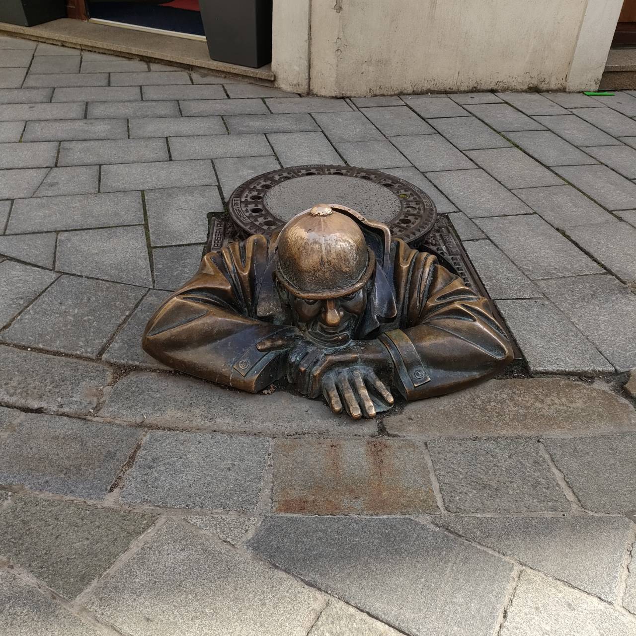 ブラチスラバの街の中にあるブロンズ像です。像とはいえ、立ってるものではなく、地面から覗いてるようなおもしろいデザインです。