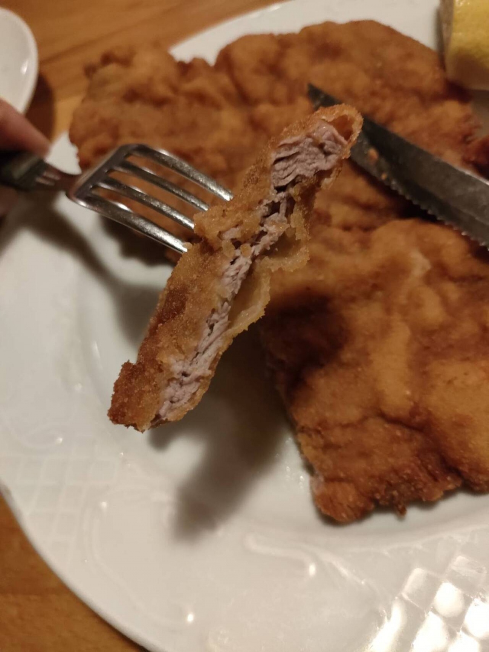 仔牛のカツレツを食べました。レモンも添えてあって味もさっぱりとしています。揚げたてで提供されるので衣がサクサクしていました。ありがたい!