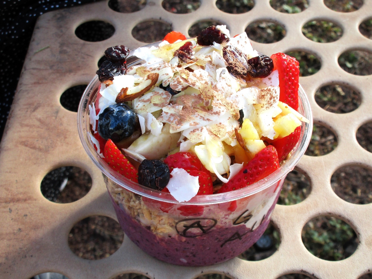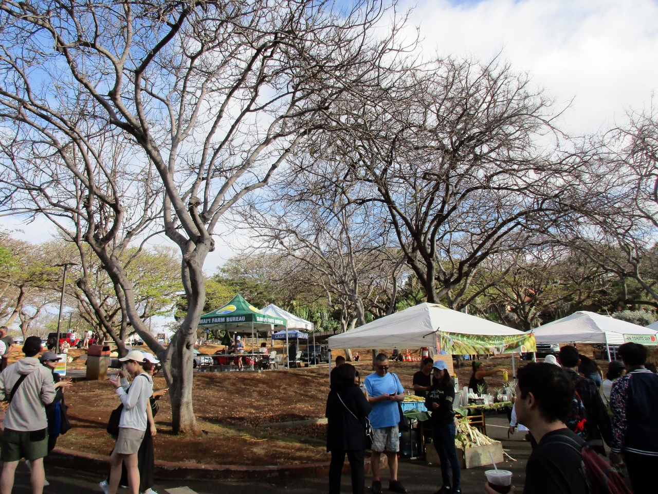 土曜日の朝だけやっているファーマーズマーケットです。食べ物関係のお店が多いです。日本人の経営している屋台がかなりみられました。野菜や果物をそのまま売っているところもあります。アサイーボウルを食べました。普通サイズで11ドルでした。