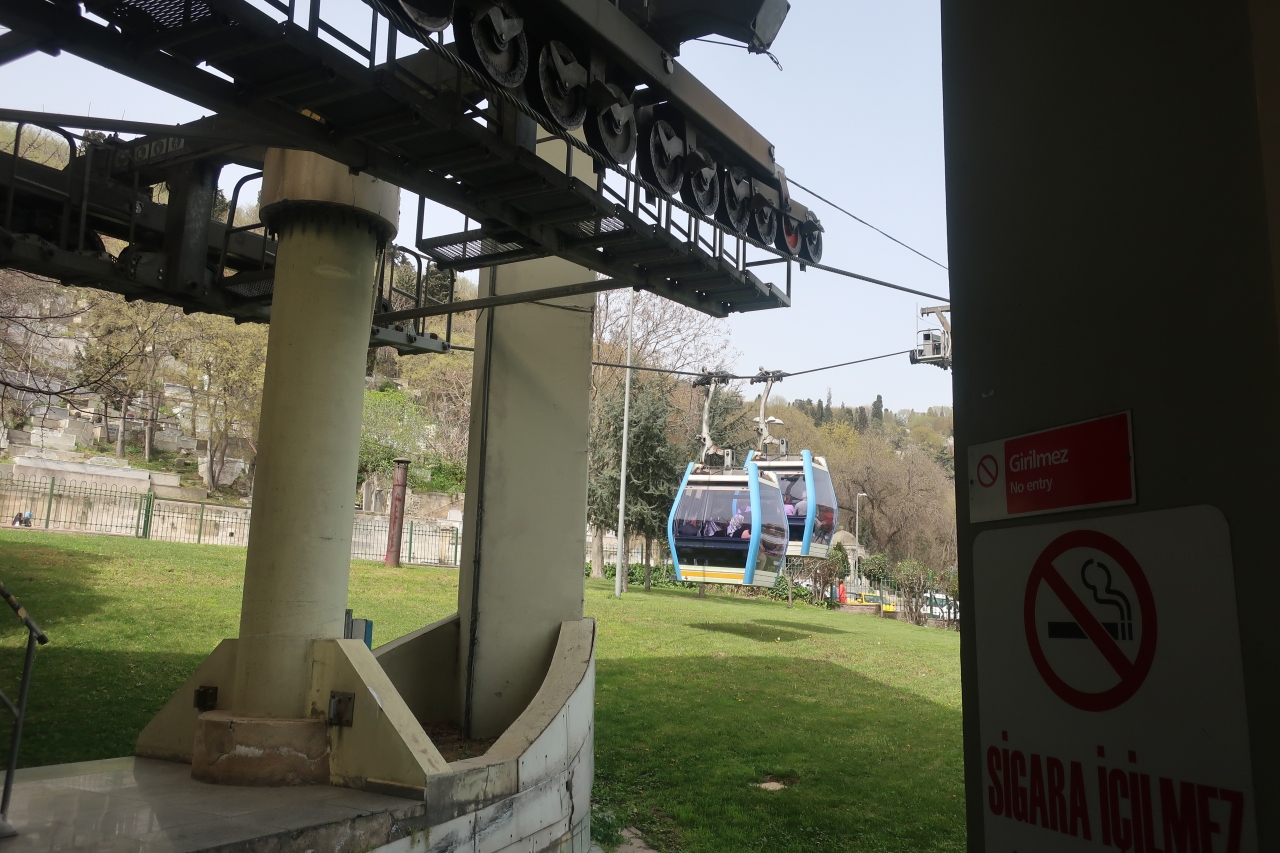 TF2線、ロープウェイ線です。新しいトラムT5線がエミノニュまで延長したので、アクセスが断然に良くなりました。山頂まで標高差はそれほどない路線ですが、金角湾の眺めを楽しめます。T5線は金角湾沿いを走るので、フェリーに乗らなくても海の景色が楽しめます。山頂は公園になっていますが、ロープウェイは途中、墓の上をとおります。