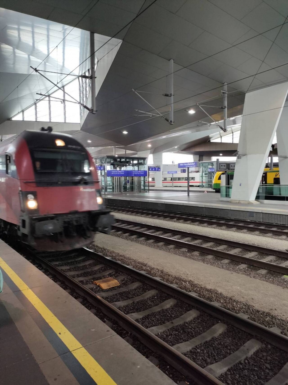 さまざまなカラーリングがあるのかもしれませんが、私が利用したのはあざやかな赤い鉄道でした。座席もゆったりしていて肘掛けもあるのがよかったです。