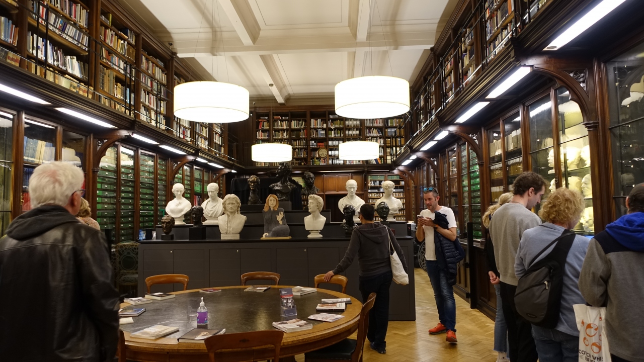 ここは約3,000点の絵画や彫刻、25,000点の版画や線画、38,000点の写真を所蔵しているが、見どころはエントランスを囲むモザイク画。アーチと柱で構成された壁面には黄金色モザイク画で描かれており、あたかもイタリアのラヴェンナにある初期キリスト教会のモザイク画を見るよう。ただ、描かれているのは神でなく一般市民。1階から2階と見る場所を変えると印象も変わる。