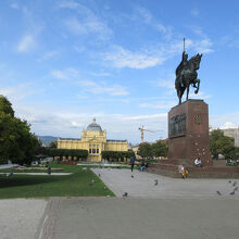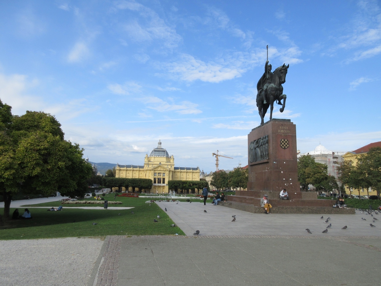 バスターミナルからトラムでザグレブ駅に向かったのですが、ザグレブ駅の電停で下車して駅の反対街に北に向かって広がる大きな公園がこちらの【トミスラフ広場】となっていました。広場の駅に比較的近い場所には「トミスラフ国王」の騎馬像が南に向かって立っており、いやでも目に飛び込んできました。青い空にすっくと立つこの騎馬像の後方には、黄色の壁面が印象的なアートパビリオンが見え、それはザグレブを代表する景観の一つといっても良い美しさでした。
