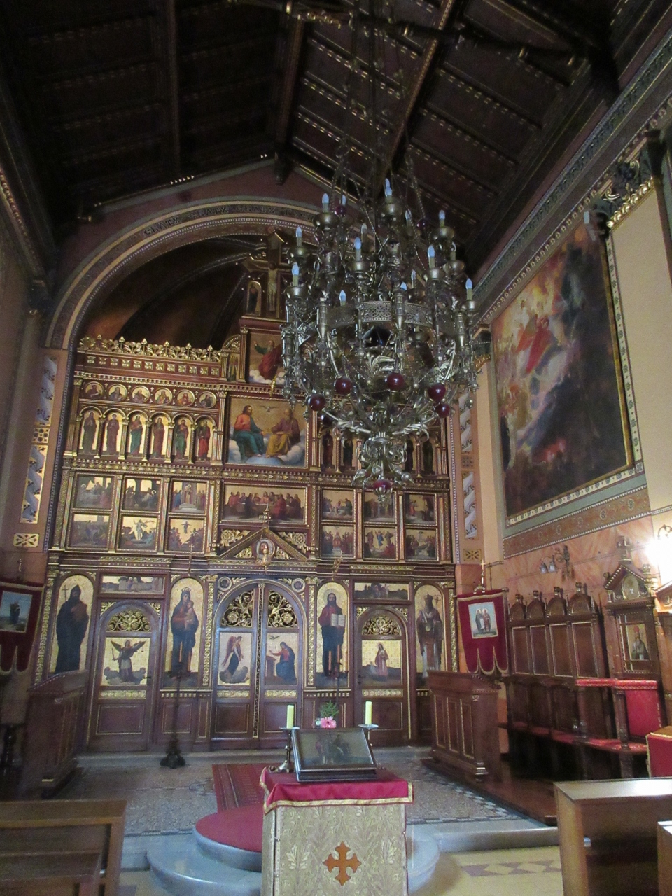 罪状十字の掲げられた正面エントランスを入ると、こじんまりのした教会の最も奥まった所にある、壁面一杯にイコンが飾られた美しいイコノスタシスを見学することが出来ました。