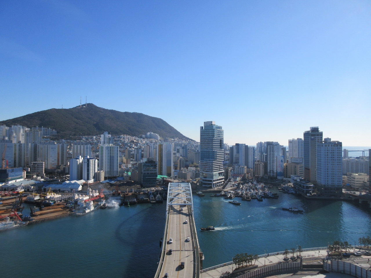 ガラスの汚れなど気にすることなく、影島や釜山港を手を伸ばせば届きそうな程に間近に眺めるが出来ました。