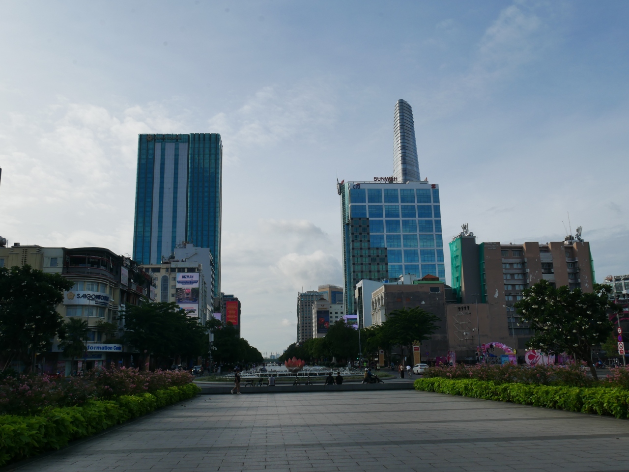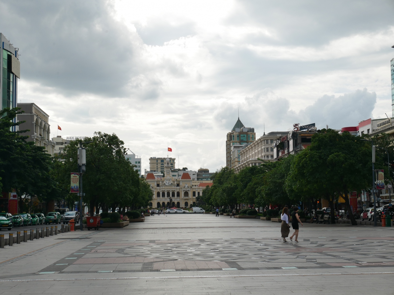 ホーチミンの人民委員会庁舎から南東側にのびる通り。道の間が公園のようになっており、ホーチミン像と人民委員会庁舎の建物をとてもきれい見ることができます。