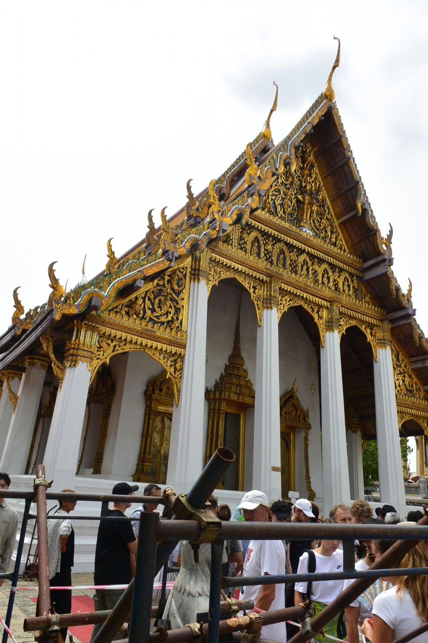 白い柱・壁と黄金の装飾がきれいな建物でした。経典が納められている一種の図書館だそうです。これだけを見ればとてもきらびやかですが、ワットプラケオ内の他の建物を見て回ったあとだったので、ちょっと印象が薄い感じでした。