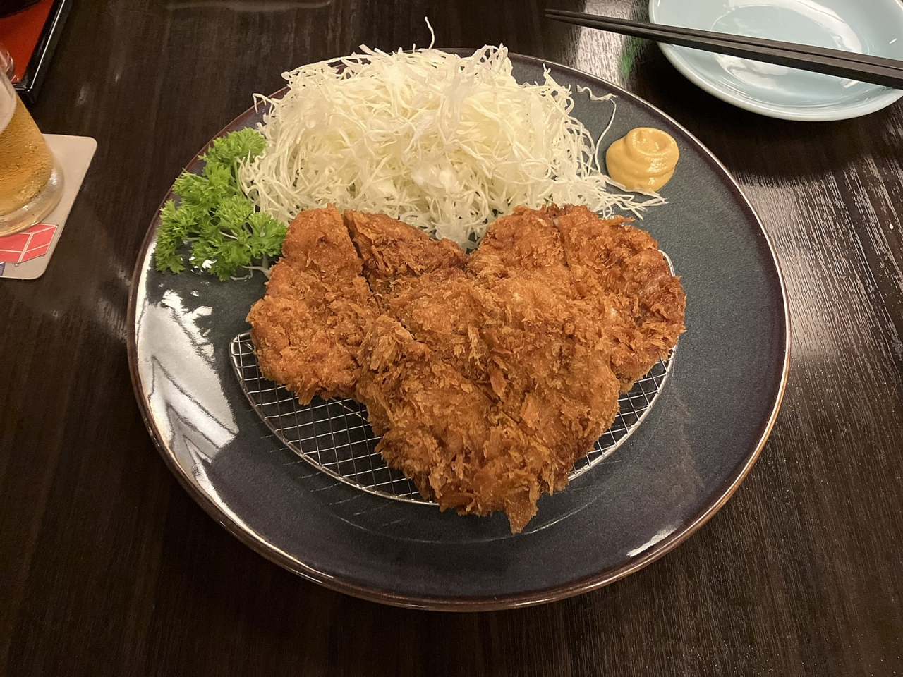 もう長い間スクンビット通りソイ11を訪れる機会がなかったのですが、今回「ホリデイインエクスプレス・バンコク・スクンビット11」に宿泊したので、うわさに聞いた「勝一」を訪れてみました。2階でエレベーターを降りるとすぐ目の前がお店ですが、入口で手指消毒が必須でした。店内の造りにも高級感を感じましたし、卓上に用意されている醤油がヤマサであることにも驚きました。またホールの店員さんの接客も良いものでした。注文したのは黒豚上ヒレカツ280THB・ごはんセット95THB・ビール(大瓶)150THB。さてヒレカツ登場、その大きさにも少し驚きましたが、やはり噂通り大変においしさかったです。値段は安くはないと思いますが、満足度からすれば決して高くはないと感じられました。