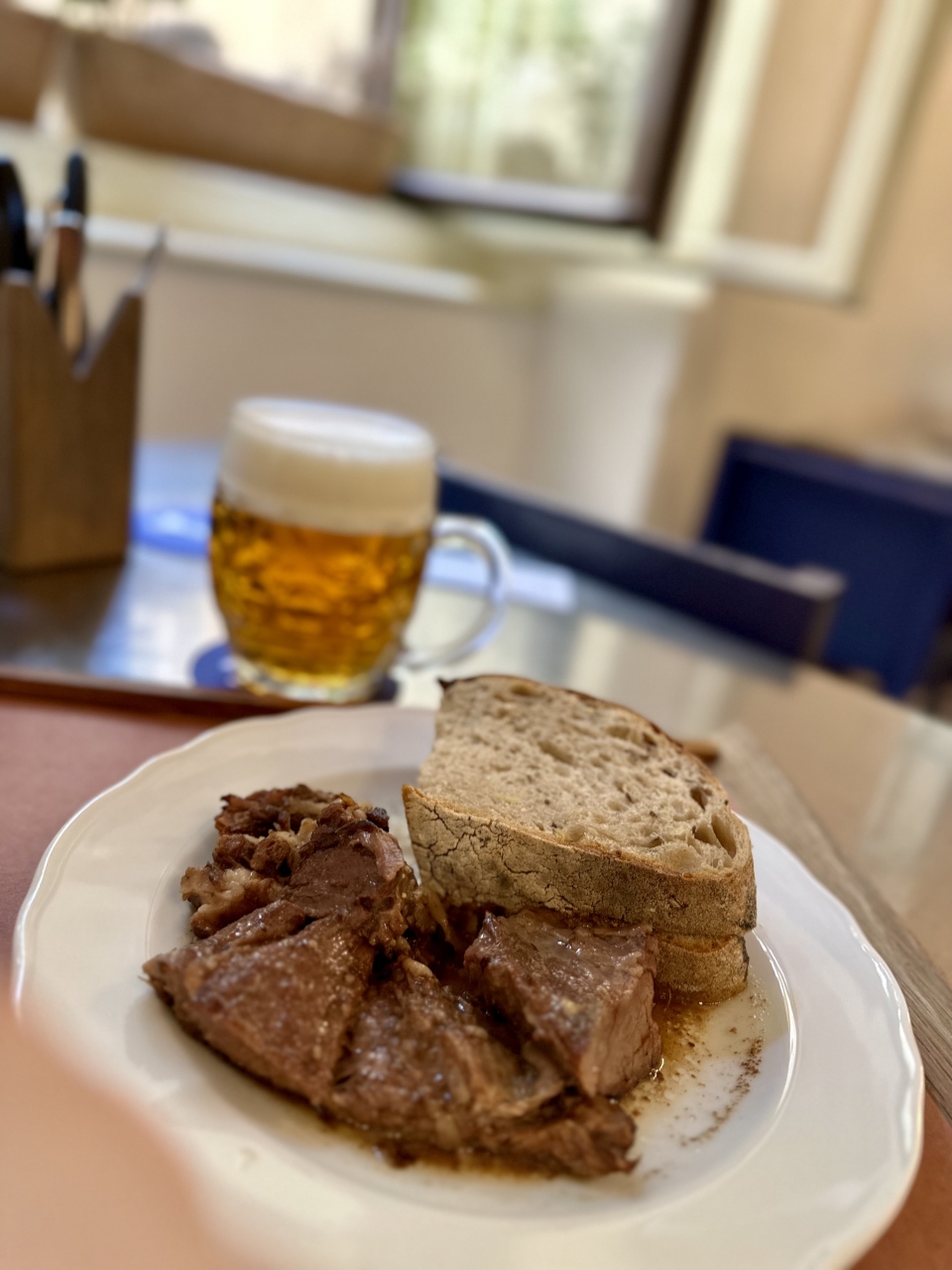 夫が楽しみにしていたカルパッチョは、まあ普通に美味しいお肉でした。和牛に慣れていると美味しくは感じませんので、わざわざ食べに行くほどではないです。反対に牛肉煮込みは独特の香りでホロホロに煮込んでありとても美味しく感じました。チェコビールも美味しいそうです。