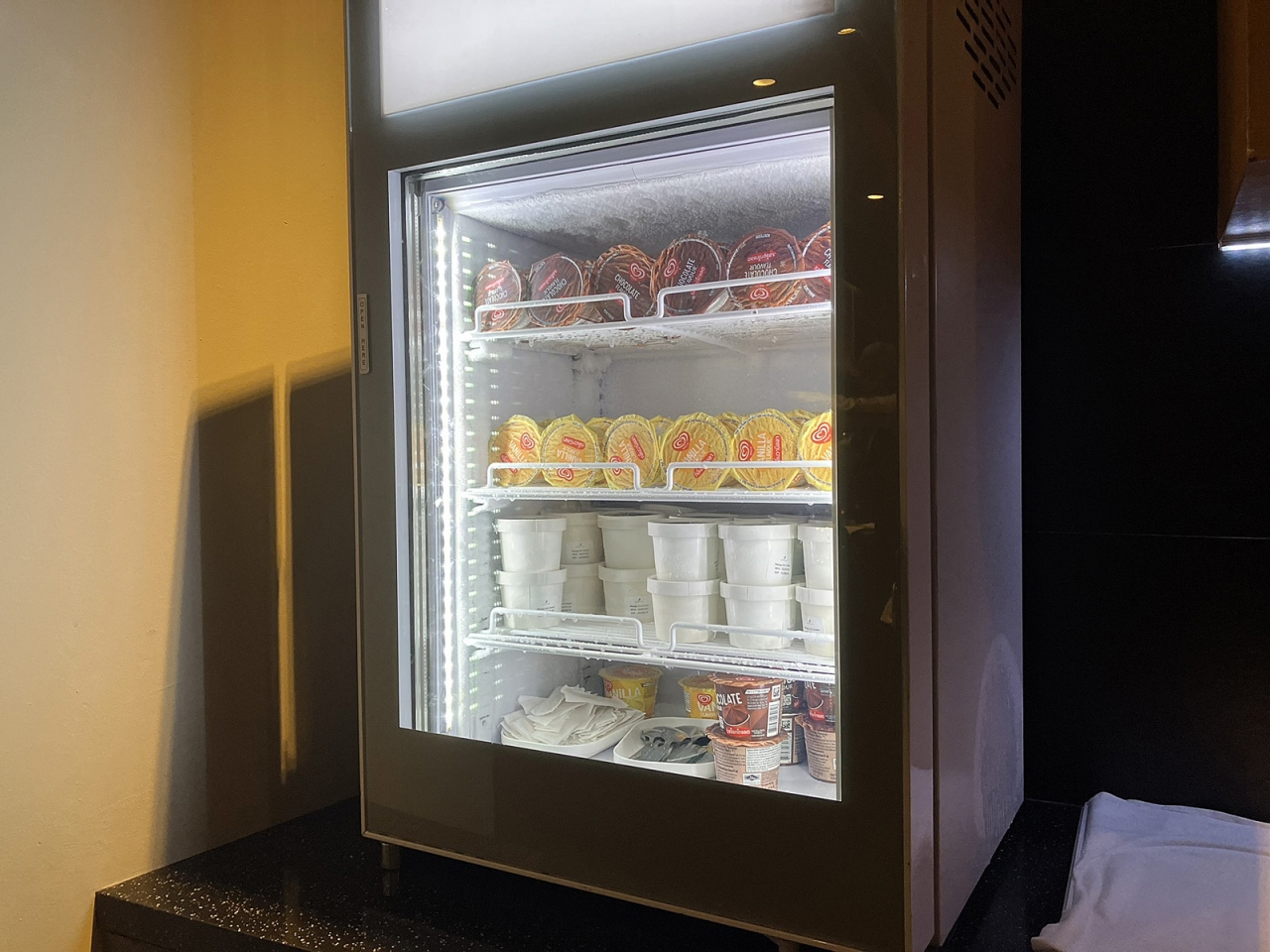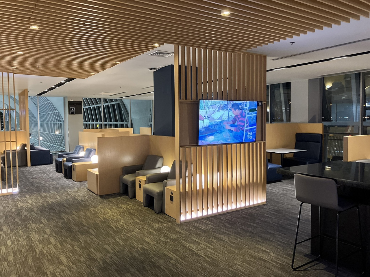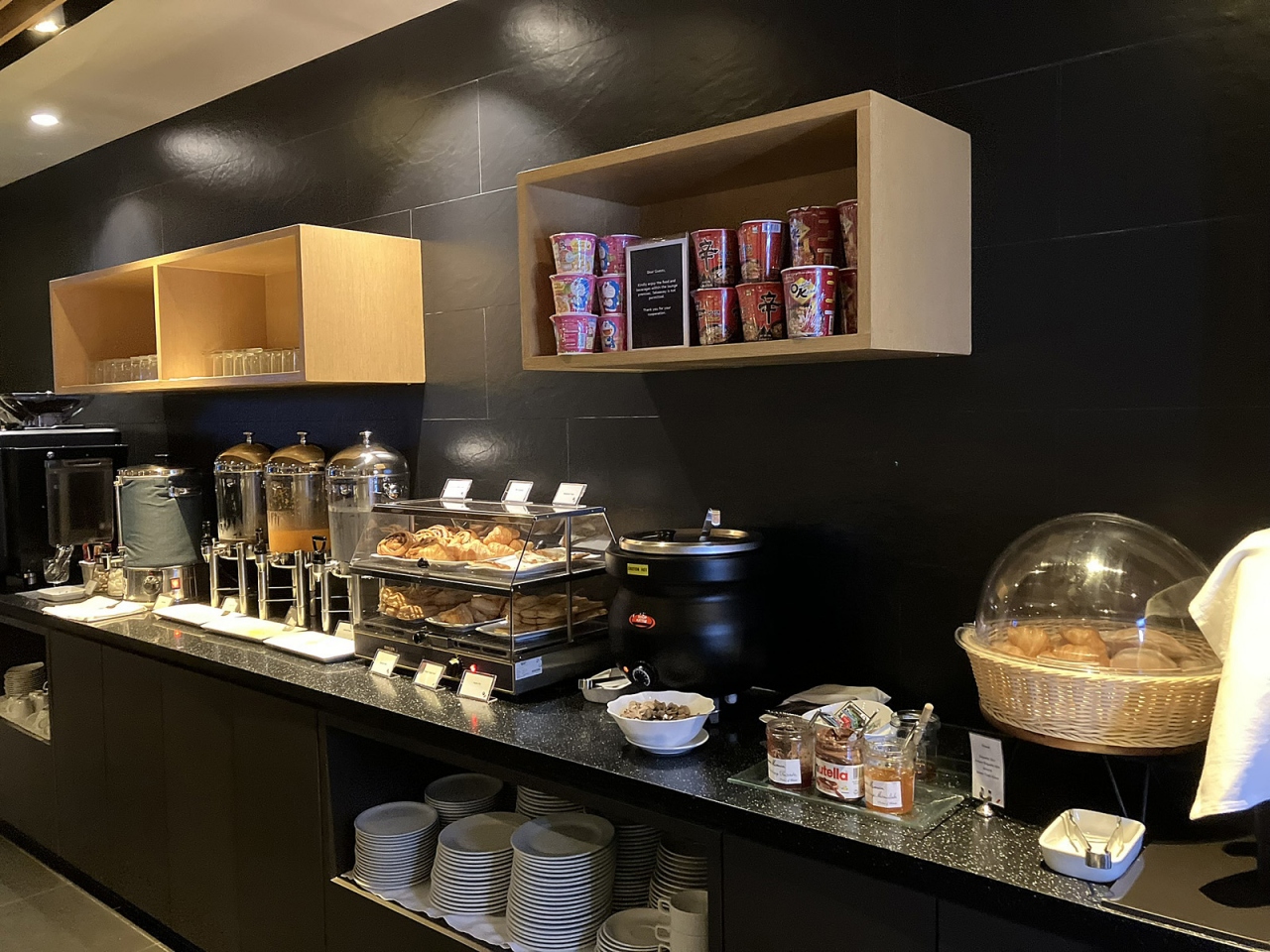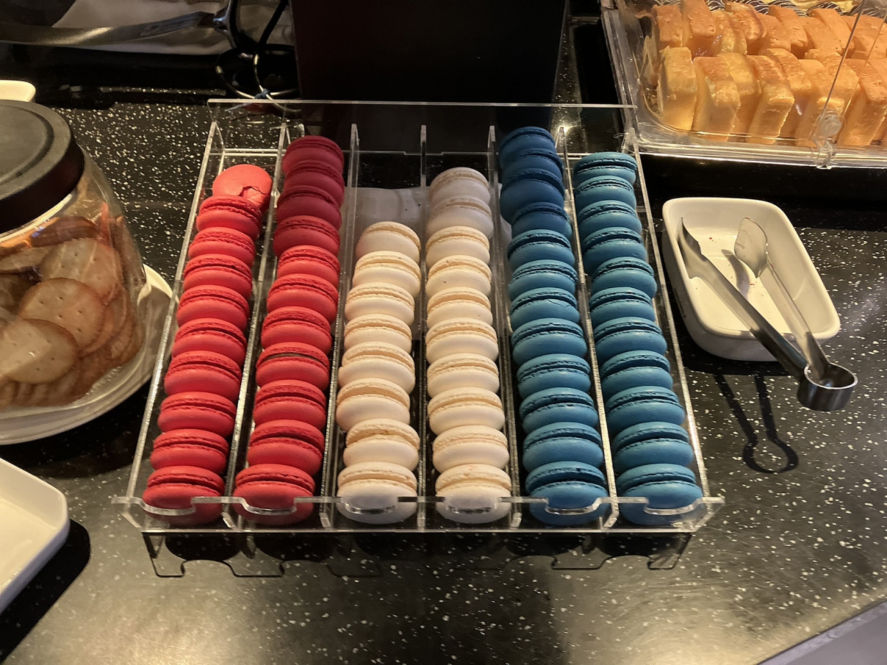 大変に久しぶりの利用になり、以前とはまったくイメージの違ったラウンジに変貌していました。かつてはフランスらしくファッショナブルな色合いで、アップルコンピューターの並ぶビジネスチックな雰囲気がありましたが、今回訪れると白木と緑を多用した造りになっており、地球環境保護をテーマにしたような雰囲気も感じました。入口右側エリアにブッフェ台とダイニングテーブル、左側エリアにはソファーが並ぶくつろぎスペースになっていましたが、そのダイニングエリアは韓国系らしい多数の客で満席、ソファーエリアにはヨーロッパ系ご婦人1人のみと対称的な雰囲気でした。フライト待ち時間を過ごす時間としては料飲レベルも十分ですし、フランスらしいマカロンもあって楽しめました。Wifiも快適でしたので、次回以降も利用しようかな。