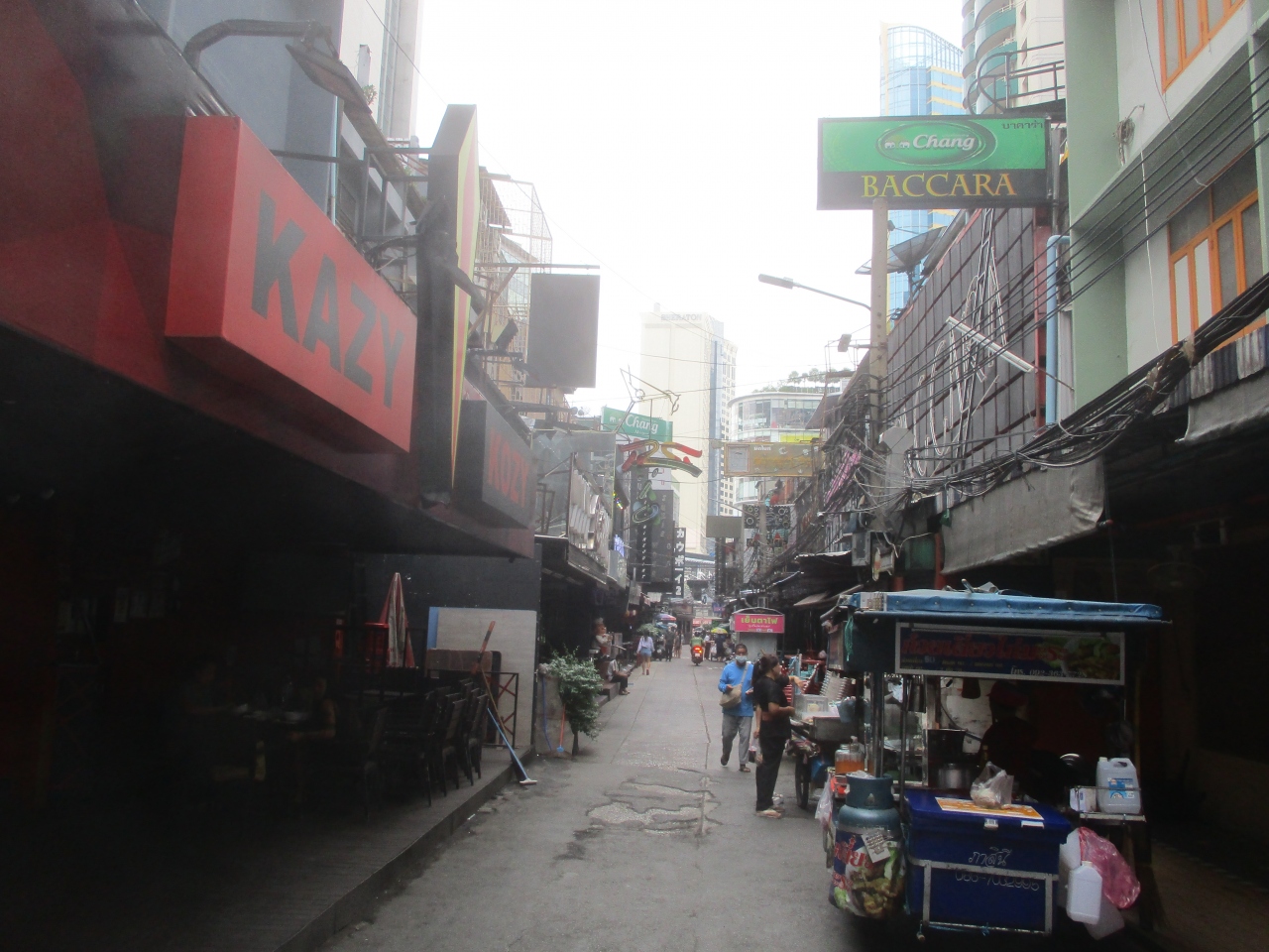 バンコクのスクムウィット通りにあるソイ カウボーイ。凄く有名な通りです。世界中からここへ酒を求めて男たちが押し寄せます。夜は華やかなネオンと大音量の音楽ですが、夜のきらびやかさを感じさせないほど、昼は普通の裏通りと言う感じでした。