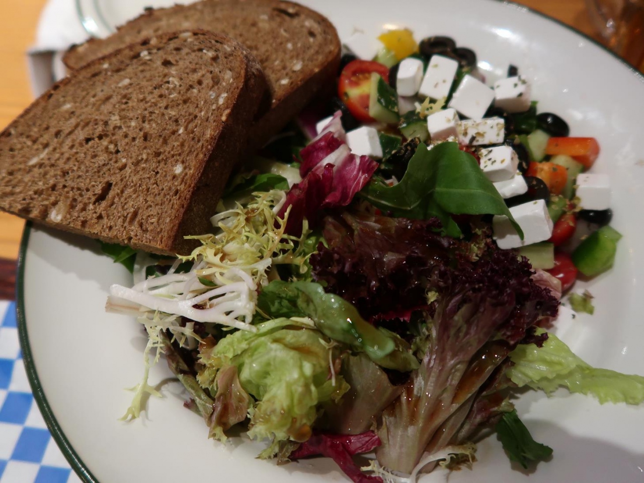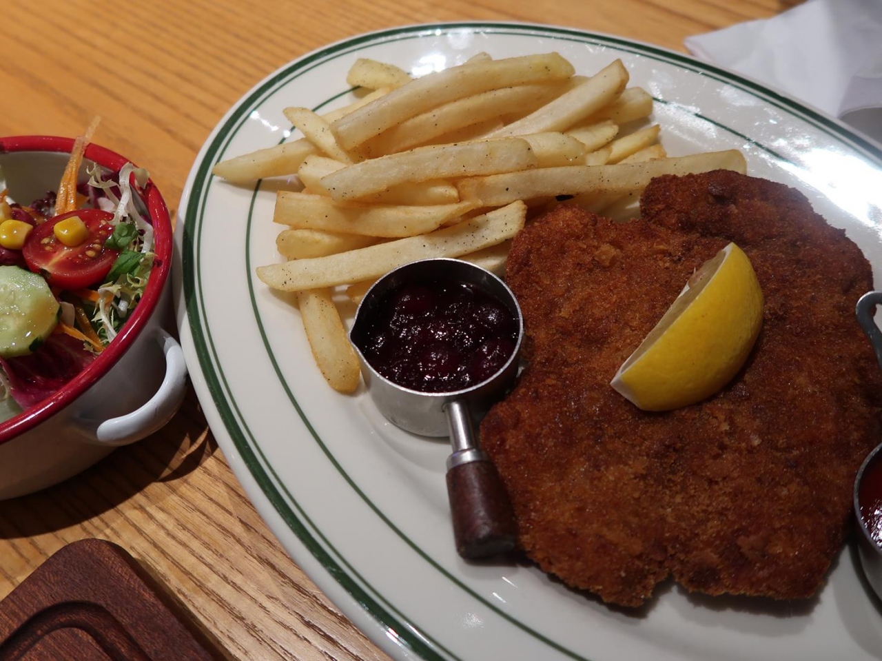 ギリシア風サラダのほかは何にしようか迷ったので、私はオーナーお勧めのグラーシュ(牛肉とパプリカの煮込み)にして、同行者はシュニッツェル(ドイツ風とんかつ)をオーダー。