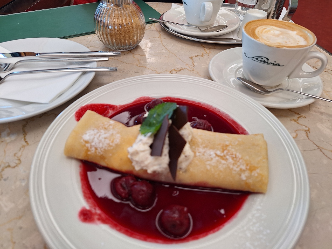 遅めのランチで軽めのクレープとカフェラテをいただく。ルーブルと並び、芸術家がよく集ったという歴史のあるカフェで、重めの食事からブランチ向けの軽食まで幅広くそろう。高級店にしては接客にイヤミが無く、一人でも問題なく過ごせた。
