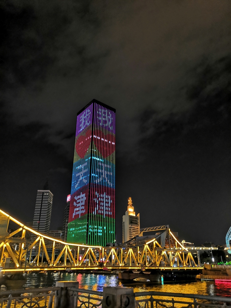 天津駅近くの解放北路に架かる橋です。地下鉄3号線の津湾広場駅からすぐです。ホテルが近かったので夜に行きましたが、綺麗にライトアップされていてよかったです。週末にも再び来たのですが、その時はかなりの人出でした。