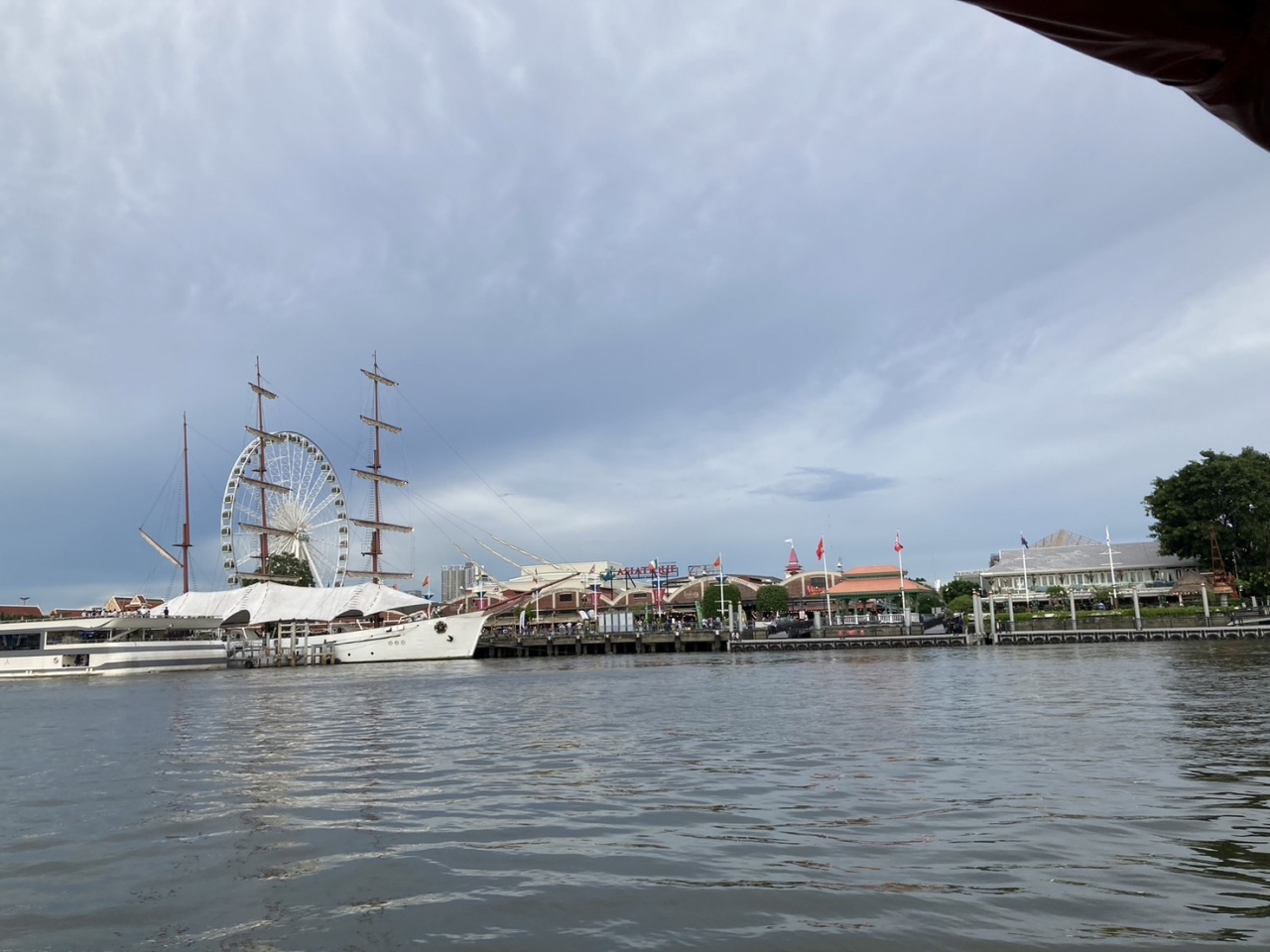 ホテルの前から無料の舟が出ているので行ってみました。観覧車は思ったより小さかったです。日本の観覧車よりスピードがあり、何周もしてくれるので楽しかったです。タイ旅行のお土産をたくさん買いました。象のパッチワークがついたTシャツや象のプリントのパンツなどがかわいかったです。
