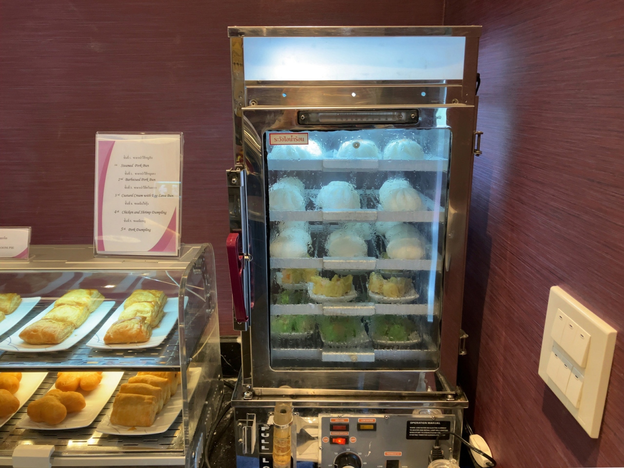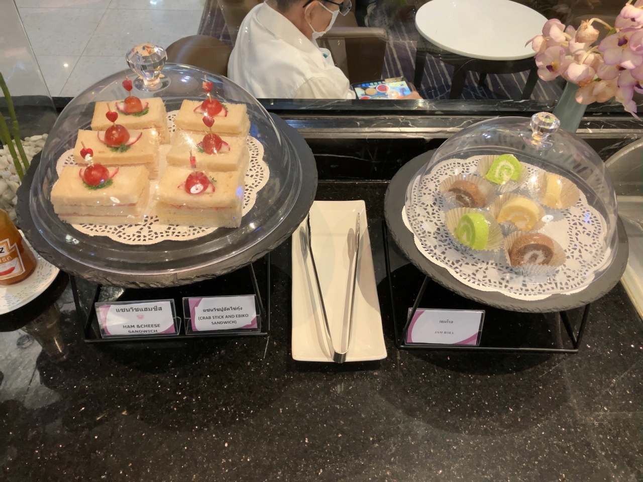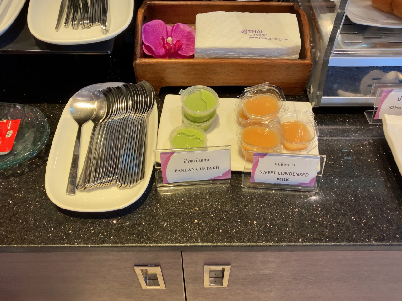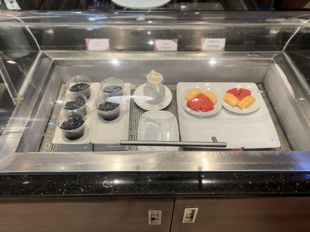 コロナ以前から、チェンマイ~バンコク間の移動はバンコクエアばかりであったため、タイ国際航空利用は久しぶりになりました。そのためラウンジが改装されていることを知り、少し驚きました。仕切りの壁が取り払われ、またソファーの配列も変わり、すっきりと使い勝手が良くなっていました。入室時間は午前8:30過ぎということで、ブッフェ台には朝食メニューが並んでいました。日本の国内線ラウンジからすると、信じられないほど食べ物が並んでいますし、パン用に塗るジャムに加えバンダンリーフで香りづけされたカスタードや練乳など、タイを感じられるものがあって嬉しいです。