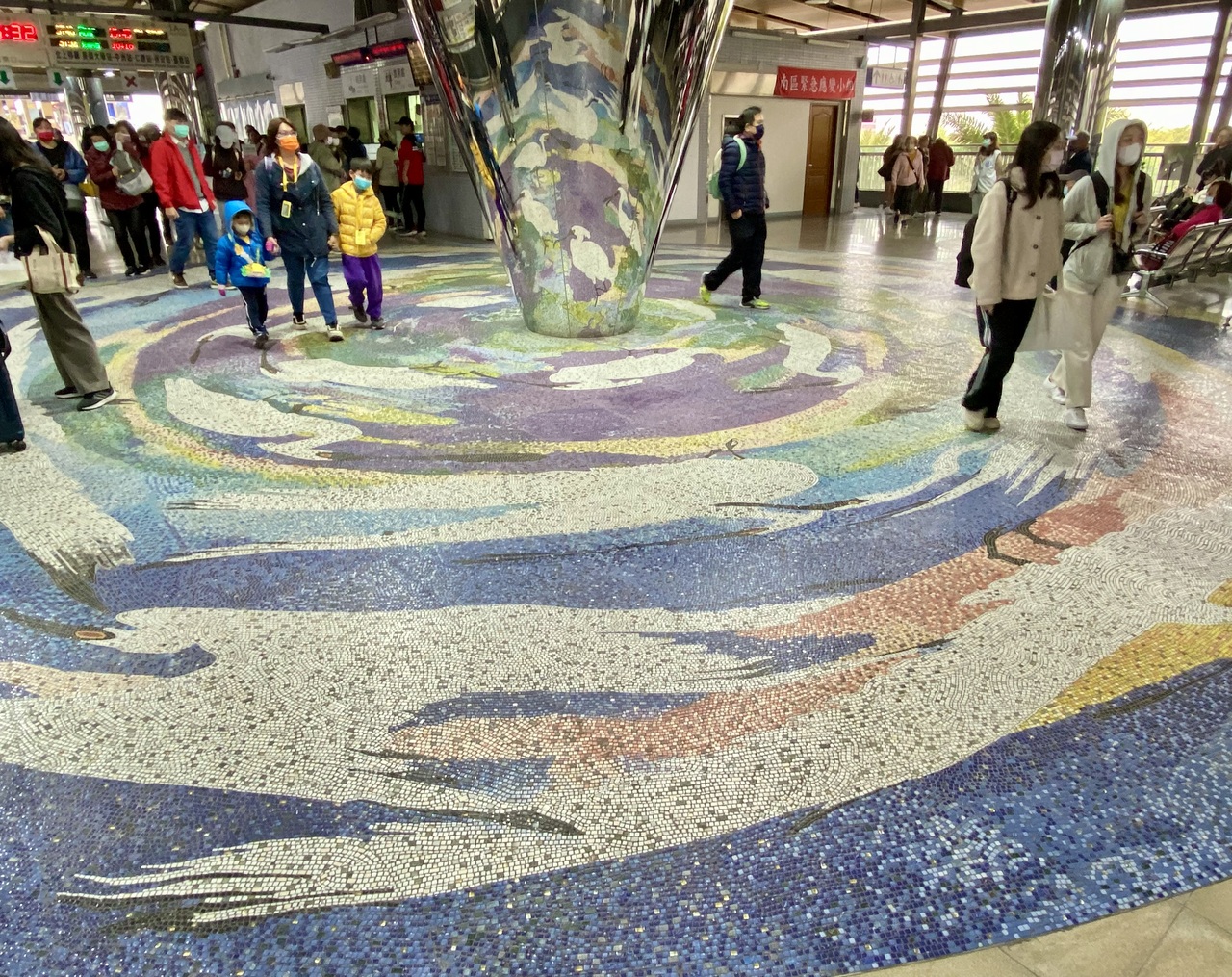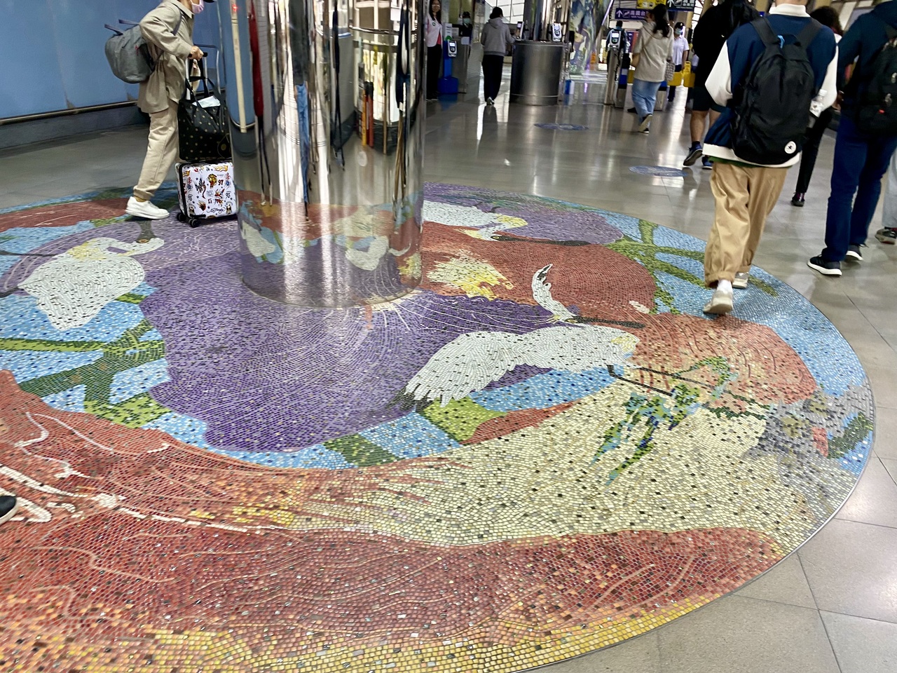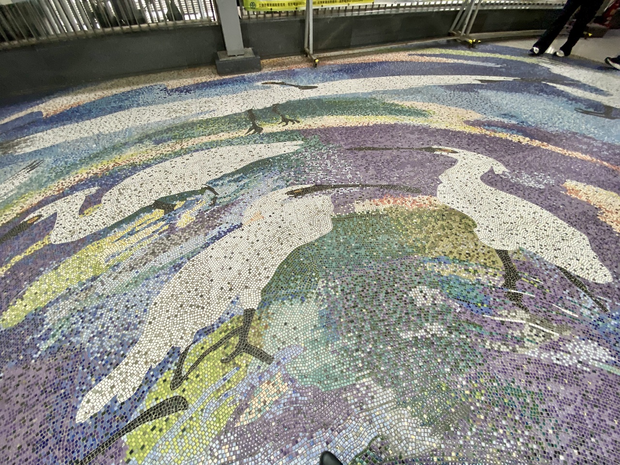 沙崙駅改札前床の、台南で越冬するクロツラヘラサギのモザイクアートが綺麗です。