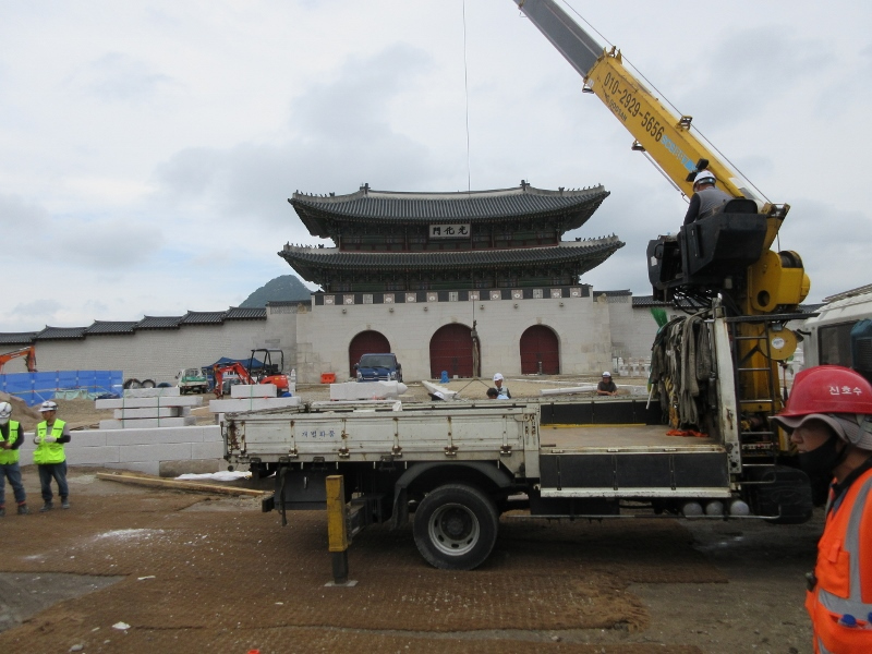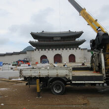 景福宮の正門である光化門ですが、残念ながら工事中でクレーン車が門の前に停まっていて近づくことができませんでした。左側に大回りして横の門から入ることはできます。青瓦台に行きたくて景福宮を突っ切ると近道だったので、大回りをすることになりました。