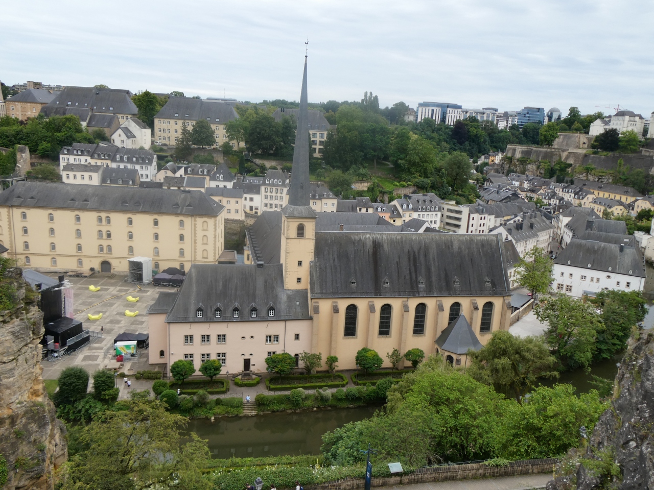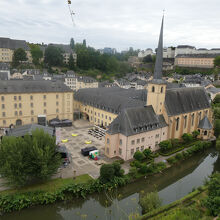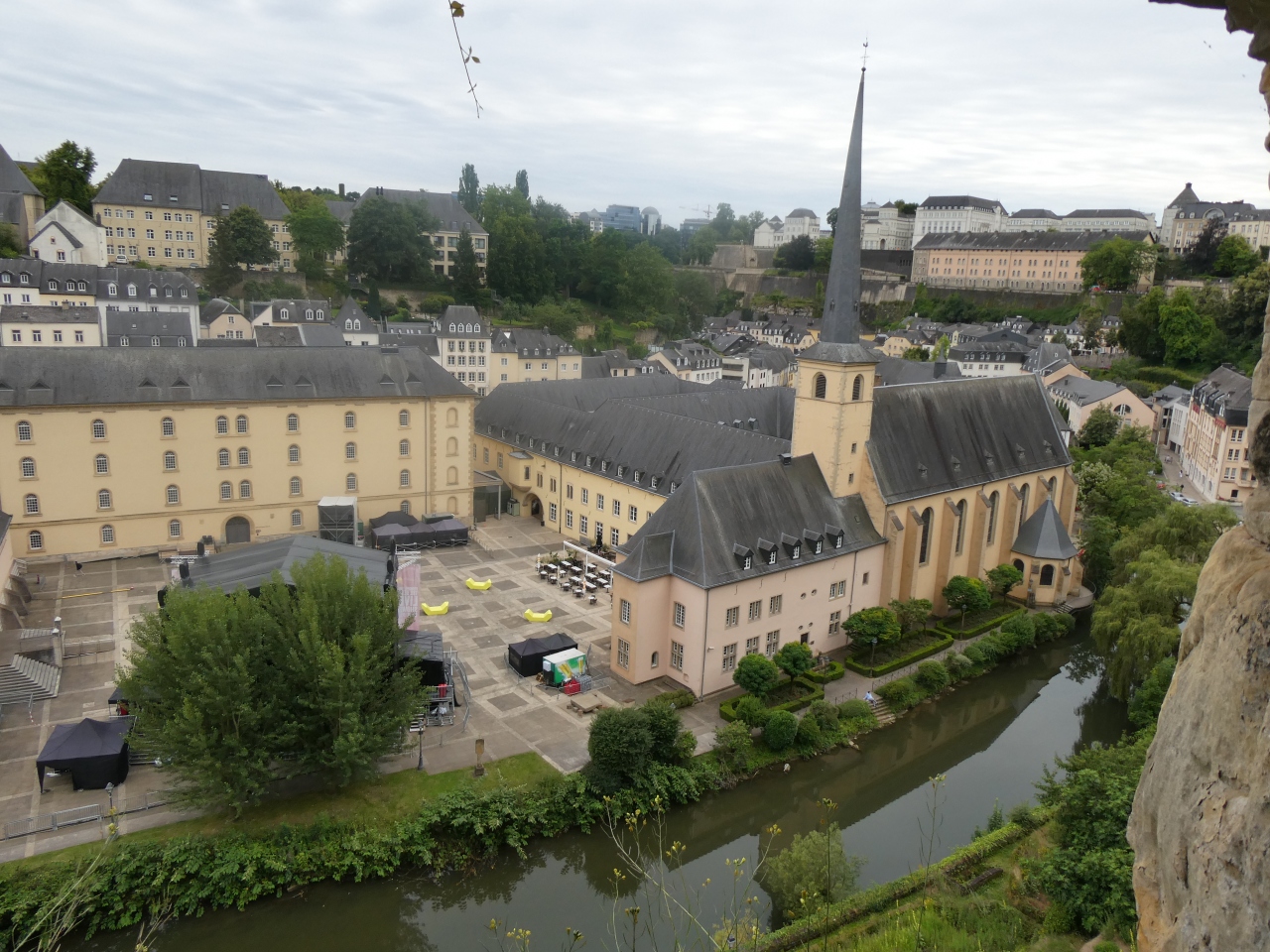 ボックの砲台から眺めると、ほぼ一体構造のサン ジャン教会とノイミュンスター修道院、東側を川が流れ、要塞の一部と思われる円柱形の塔や石橋もあり、中世景観が今日まで保存されているように思われます。ルクセンブルグを代表する美しい景観と感じます。
