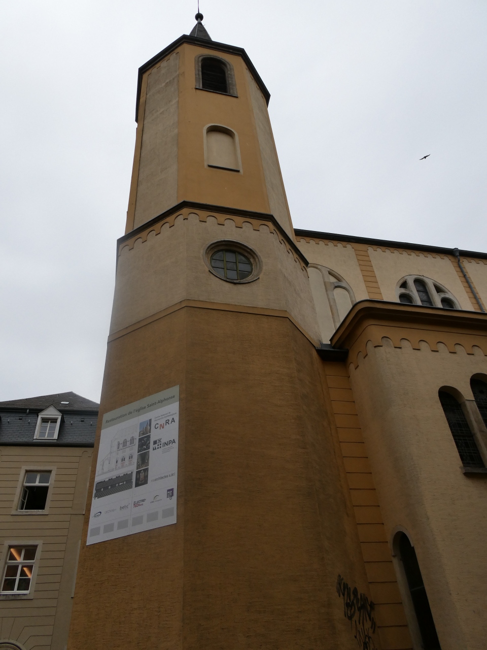 聖アルフォンス教会(Eglise Saint Alphonse)は、旧市街の中心部ボーモン通り沿いにあるカトリック教会で、ネオロマネスク様式の美しい建物です。茶や肌色系の多角形状の建物の上に黒茶系色の尖塔が聳えています。内部は比較的質素な印象です。