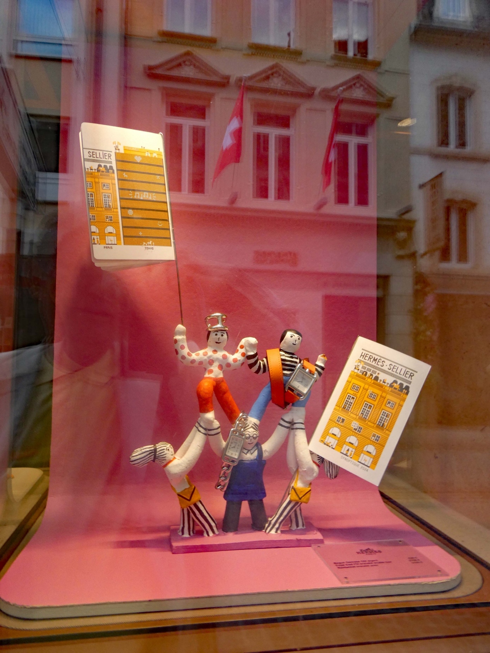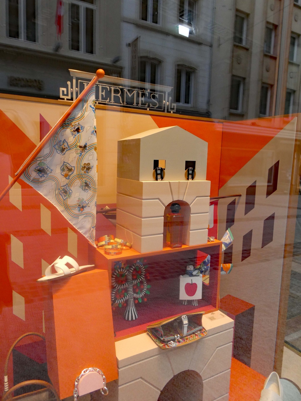 エルメスのショーウインドウは、人形、小さな家、旗など童話的な飾りつけがされ、商品は殆ど展示されていませんでした。商品が見たい方は、お店の中にお入りくださいと訴えているようです。お店は開いていましたが、平日の昼過ぎ、お客は店内には見当たりません。十分な売り上げがあるのか、心配になります。