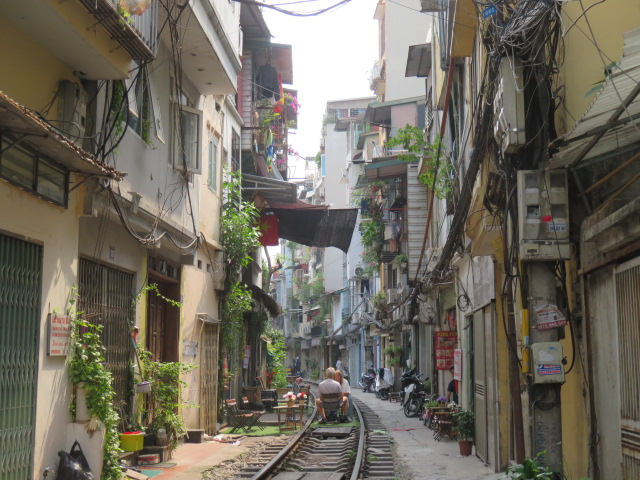 ハノイでしか見れない唯一無二の光景です。両側に、家が密集している間に線路が通っています。カフェもたくさんあって、線路の向こう側でイートインできるようになっています。この状況で、電車が通るたびにこれらのものを片付けます。すごいですね。