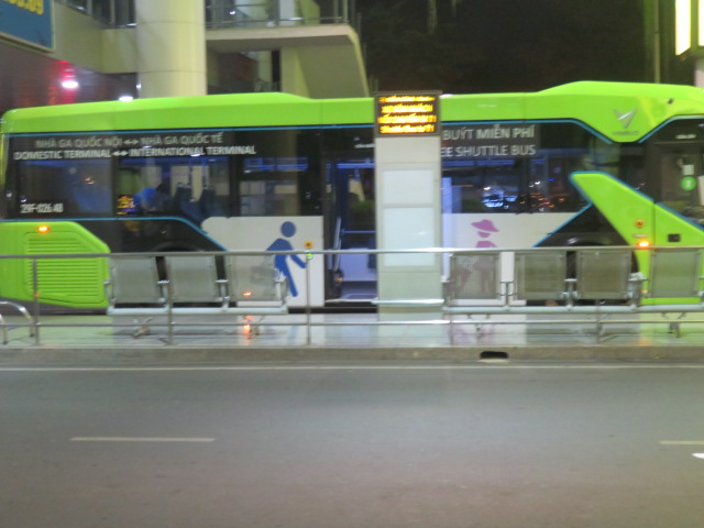 ハノイの旧市街から86番の路線バスに乗って、国際線バスターミナルに到着しました。ここから国内線に乗り換えるのに、シャトルバスが走っています。黄緑と白のツートンカラーで、よく目立ちます。本数も多いので便利です。