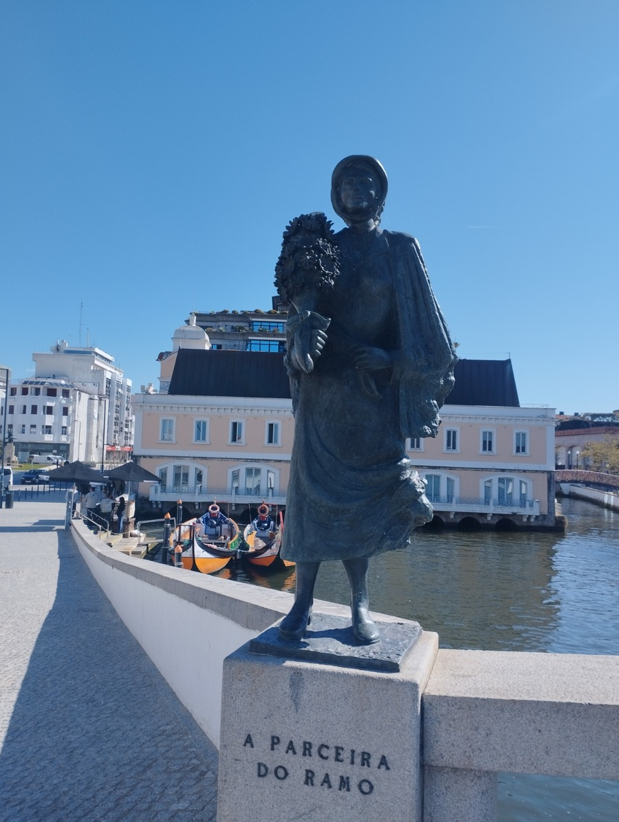中央運河をまたぐウンベルト・デルガード広場の欄干に像がありました。花束を持ち祭りの衣装姿の「ア・パルセイラ・ド・ラモス」、ロケット花火を持った「オ・フォゲテイロ」。運河を背景に欄干の美しい像がとても素敵でした。像の前で写真撮影がお勧めです。