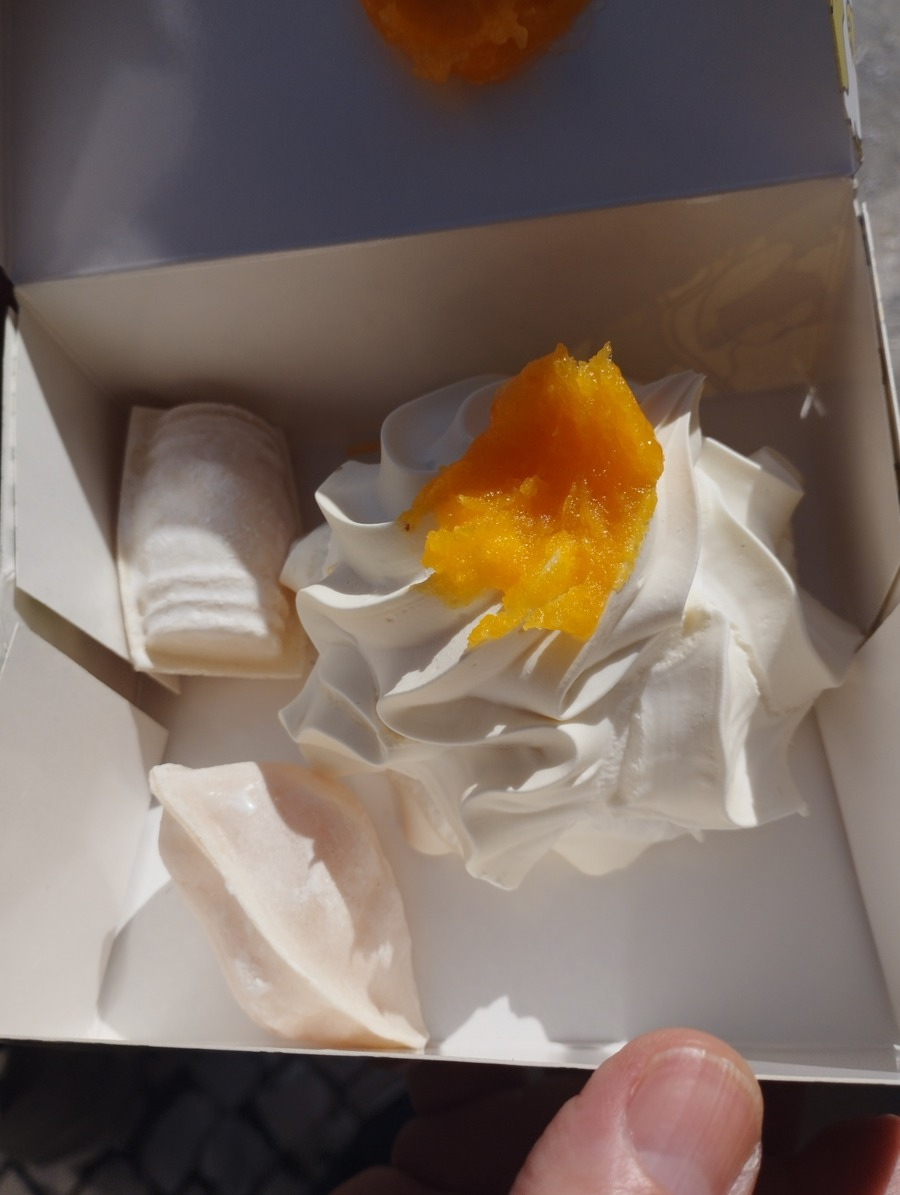 お洒落な箱に入れてくれましたオヴォシュ・モレーシュの樽形と貝形 1個1.6ユーロ(約256円) ススピーロ(suspiro):ため息という名前のお菓子 メレンゲを焼いたお菓子に卵黄クリームを載せたものを買いました。