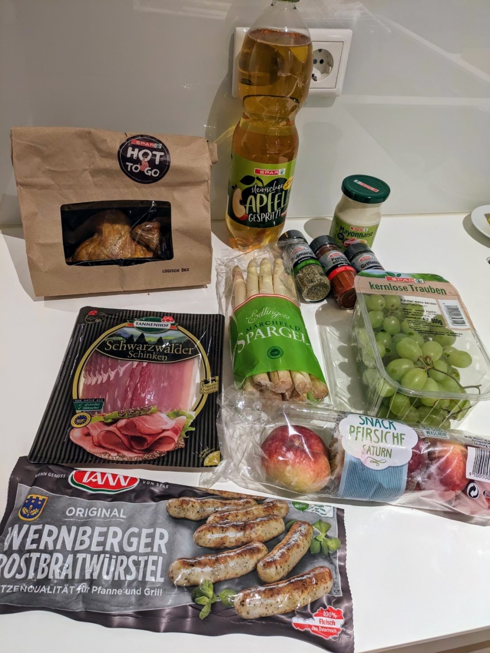 丸鳥のオーブン焼き、生ハム、ソーセージ、果物(ぶどう、桃、リンゴ)、