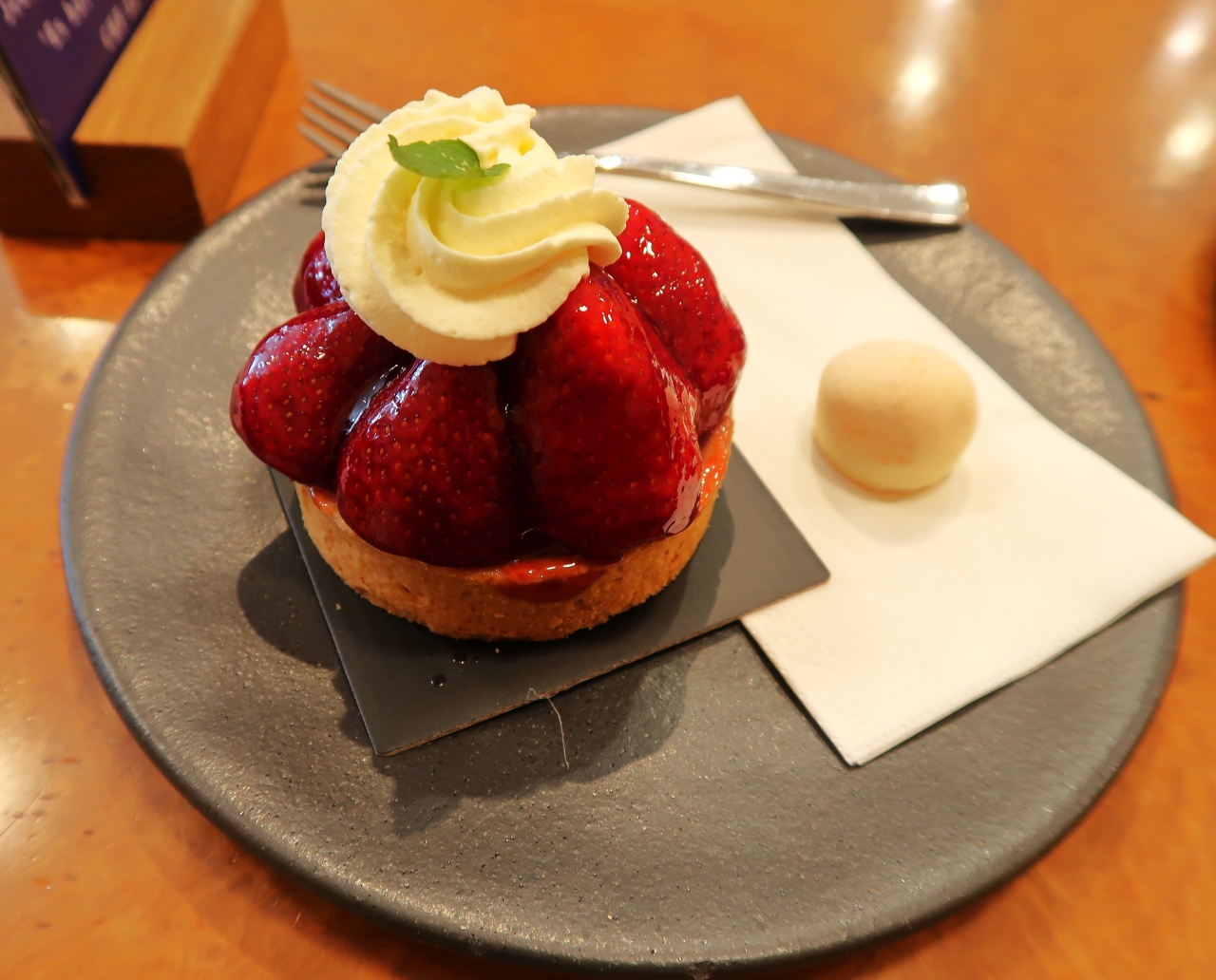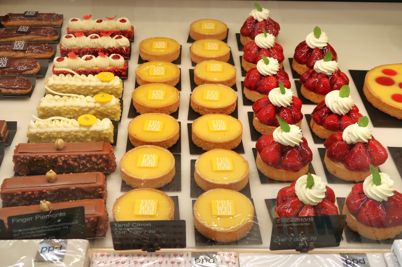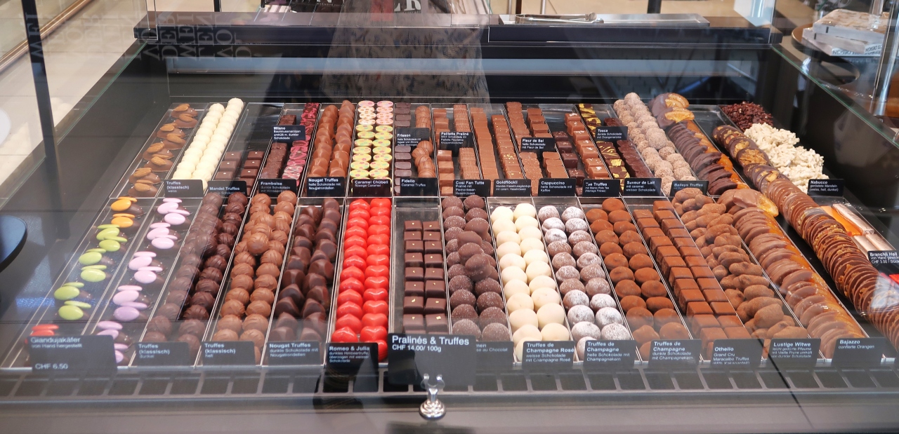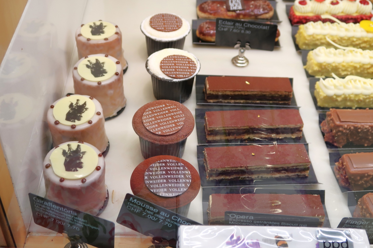 ヴィンタートゥールの町をを代表する高級チョコレート店です。夏でチョコレートは持ち運べないので、エアコンの効いた涼しい店内カフェでいただくことにしました。ダークチョコレートのシャンパントリュフ、ロゼシャンパンが入ったピンクシャンパントリュフ、75年間ずっと売上一位の人気を誇るというGiraffentortli、苺のタルトを注文、カフェオレにはさらにチョコレートが一つサービスで付いてきました。ピンクシャンパントリュフは、ミルキーな味わいでした。ダークは赤ワインに合うチョコレートでした。チューリッヒの菓子店に比べると、お値段もお手頃で、おすすめのお店です。