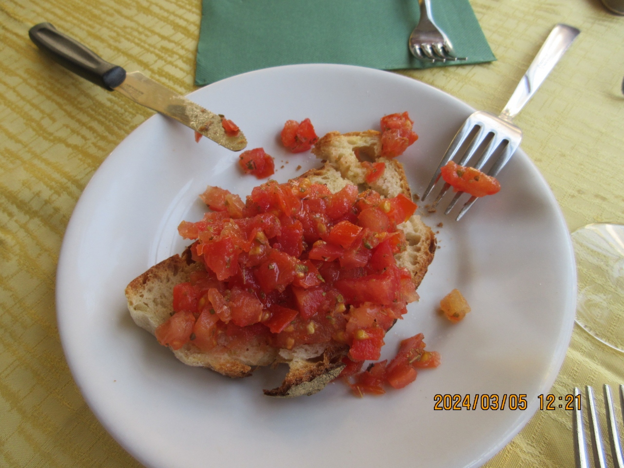 トマトのブルスケッタ、スパゲッティかペンネのパスタ、肉か魚、