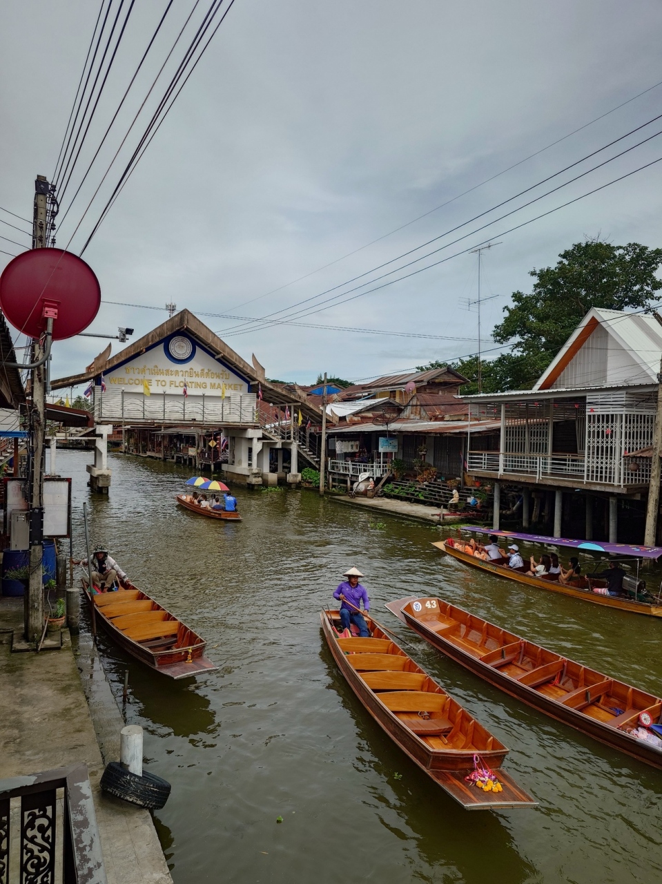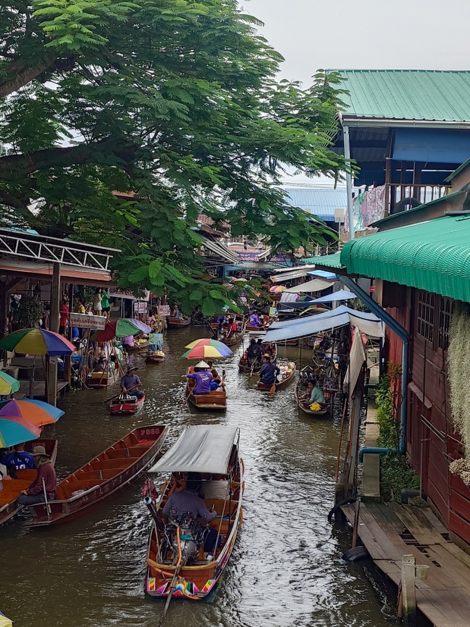 メークロン線路市場とダムヌンサドゥアック水上マーケットのツアーで訪問。最初、エンジン付きの船に乗せられて、途中で手漕ぎの船に乗り換えました。