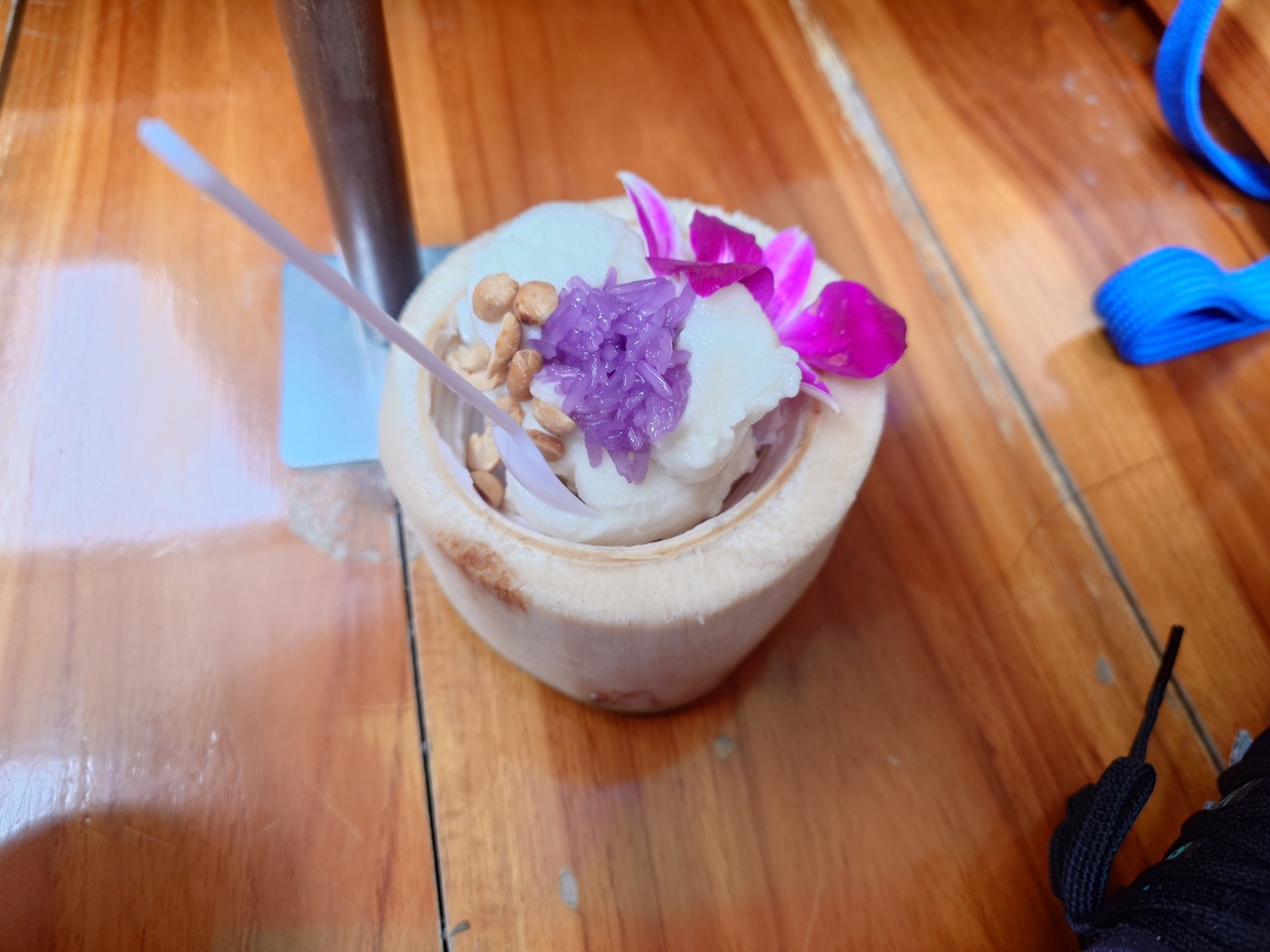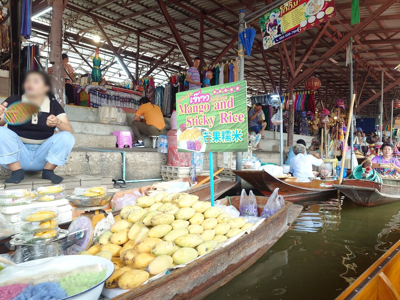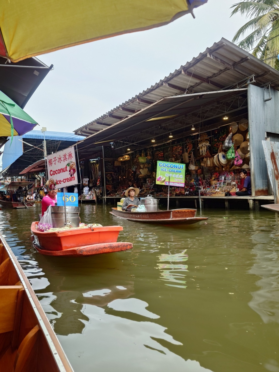 添乗員さんも水上マーケットの商品は高い、買うなら値切ること、食べるなら60バーツのココナッツアイスがオススメ、とのことでした。ココナッツアイスはどこでも60バーツで値切る必要はありませんでした。うまく船を停めてくれたところを見ると、船頭さんと繋がっているのかもしれません。ココナッツアイスは、ココナッツの甘さがしっかりあって美味でした。暑い季節には最高です。水上だけあって、しつこい販売はないので安心です。「買い物」というよりは「見る」「楽しむ」ところかもしれません。
