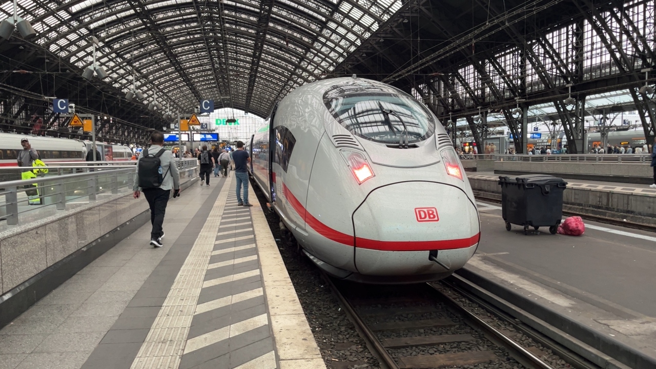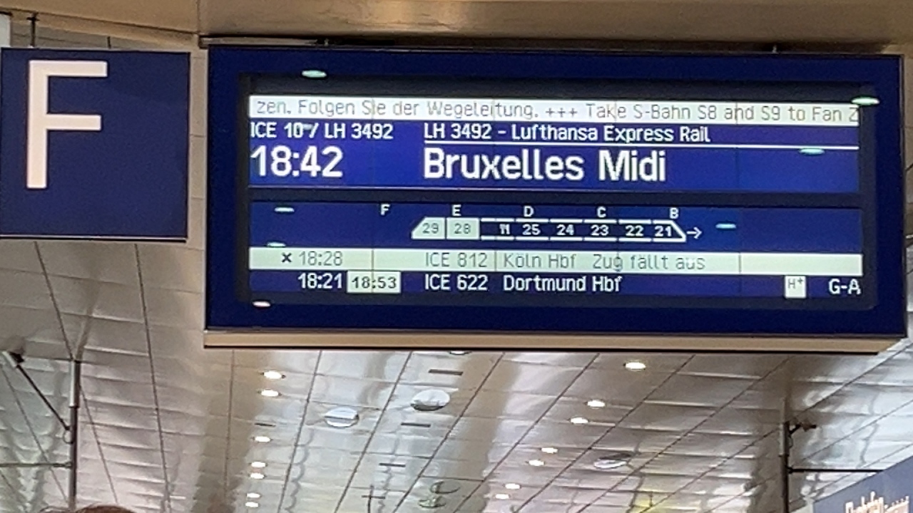 フランクフルト空港-ケルン間のICE。30分以上遅れました。アナウンスなし。電光掲示板では、前発と後発の電車がくるくる入れ替わるし、ホームまで変わるんじゃないかととてもヒヤヒヤしました。みな落ち着いていて、遅れはしょっちゅうなんだと思いました。料金はうんと前に買わないととても高い。安いチケットは変更がきかないので、計画するときは遅れを考慮して購入する必要があるようです。この後、ケルンーアーヘン間のローカル線は遅れませんでしたが、ライン川沿いのローカル線は定刻をうんと外れた運行をしてました。ローカル線の切符は日本から事前購入ができず、当日DBアプリから購入しました。DBアプリもちょっとくせ者です。