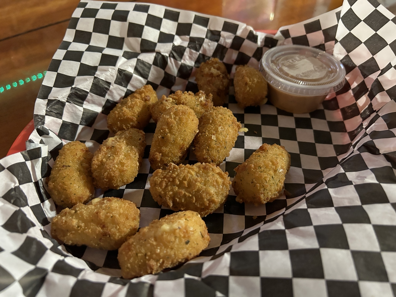 妻は「ピクセルズ(Pixels)」と名付けられたIPA、私は「ヴァニラ・ザ・ハン(Vanilla the Hun)」と名付けられたポーター(黒ビールの一種)をチョイス。ビールのアテには「スモーク・ゴーダ・マック・アンド・チーズ・バイツ」…アメリカのおふくろの味であるマックンチーズを、小さく丸めて揚げたものです。これイケる! そして「オニオンリング」。茶色一色ですが、これこそがアメリカ南部流。