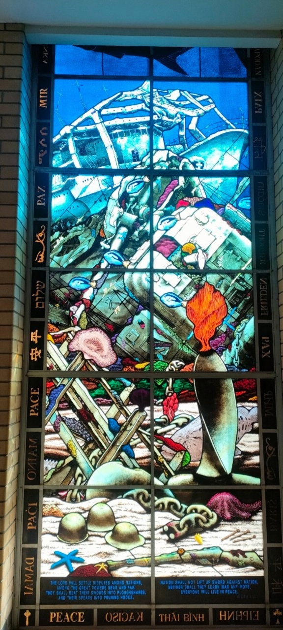 珊瑚や戦争をモチーフとしたステンドグラスが美しい教会でした。