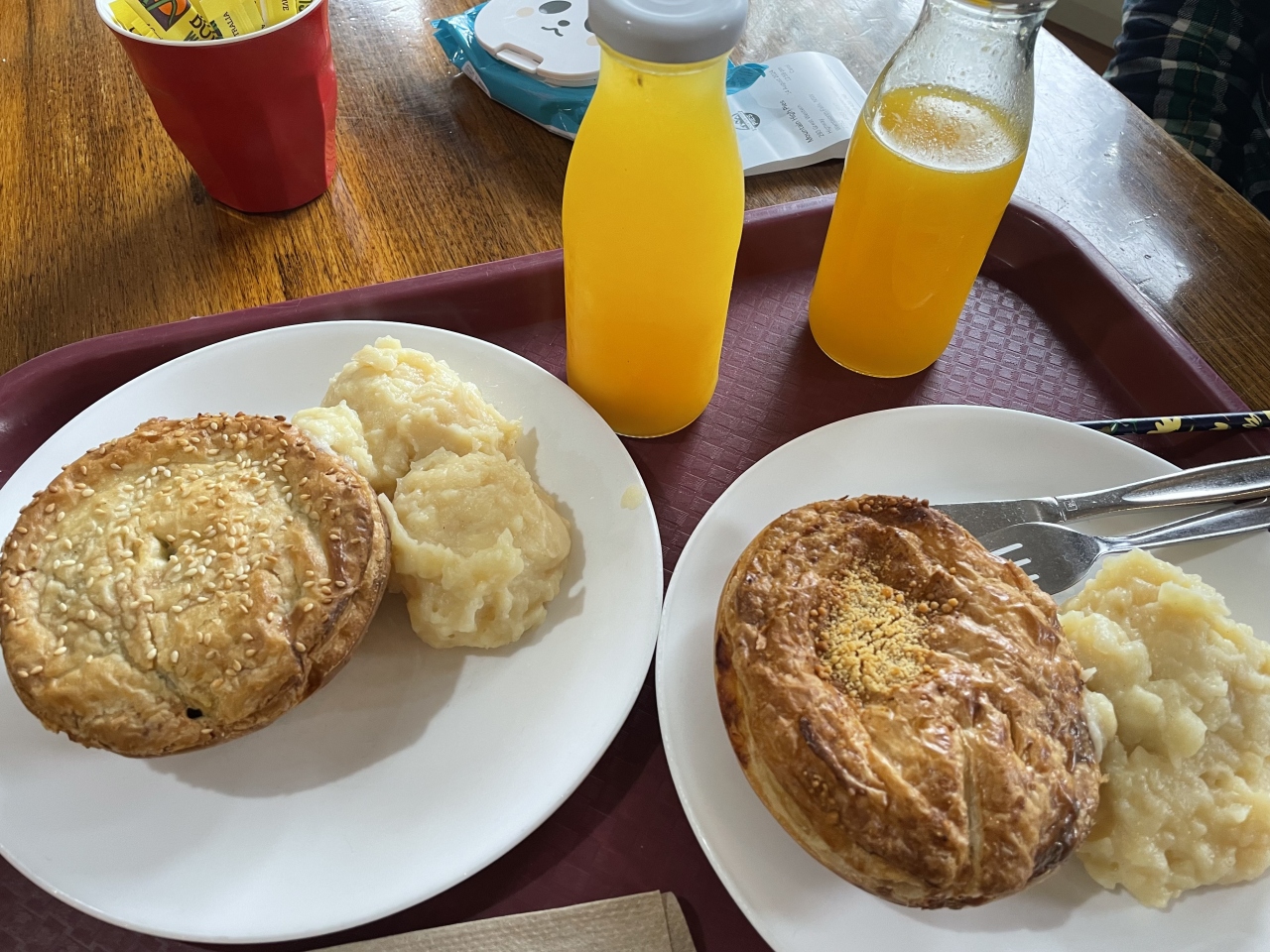 一人1つずつパイを買い、サイドメニューでポテトがあるか尋ねるとマッシュポテトがあるとのことだったのでお願いしました。他にもグレイビーとかマッシュピーはいらないの?というようなことを聞かれましたがマッシュポテトだけお願いしてお会計。ベテランっぽい店員さんでしたがマッシュポテト代が含まれてなかったので無料で追加できるようです。パイも美味しかったのですが、マッシュポテトでおいしさ倍増したので追加をおすすめします。
