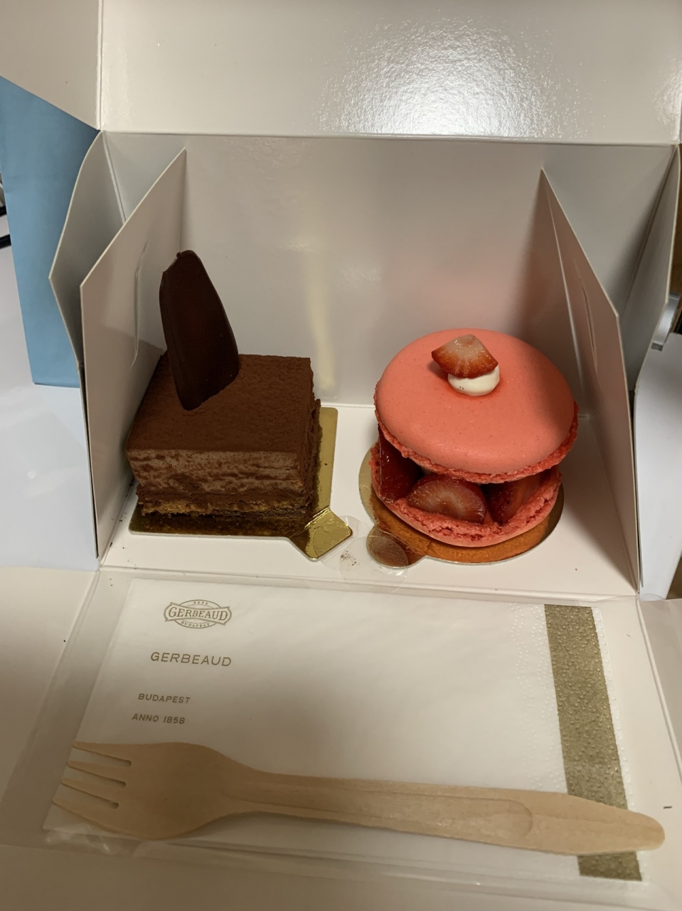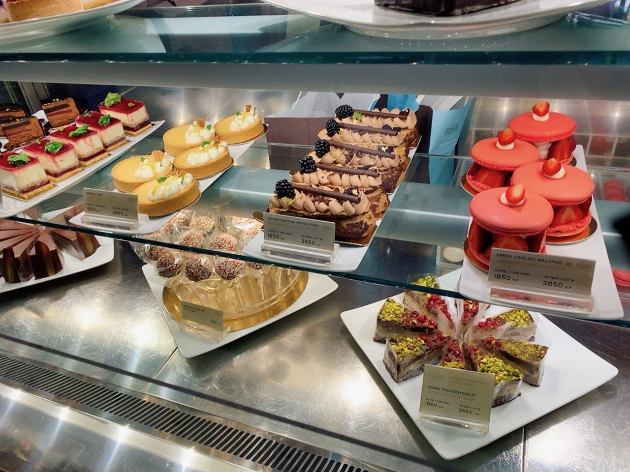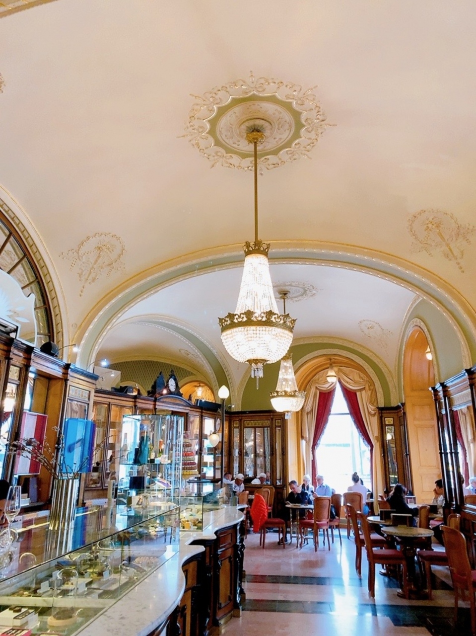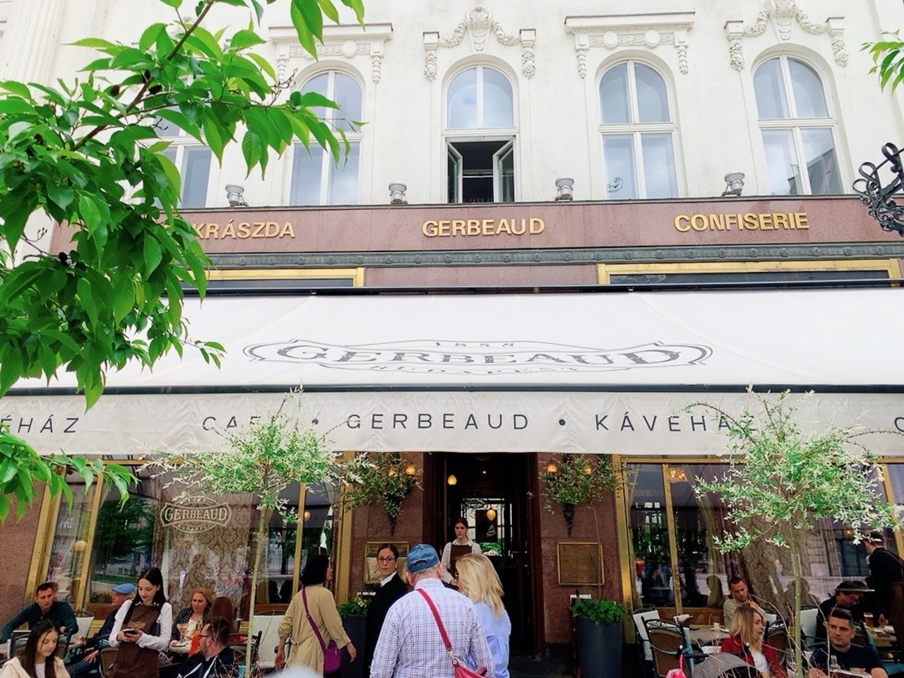 ヴルシュマルティ広場にあるGerbeaud(ジェルボー)というカフェに行きました。 この後の予定が詰まってるわけでもなかったので、イートインでケーキとドリンクを楽しんでも良かったんだけど、イートインとテイクアウトの価格設定の差に度肝を抜かれ(イートインは2倍の値段!)、勿体なさ過ぎるのでテイクアウトすることにしました。 海外旅行中なわけだし、こんな豪華絢爛なカフェでお茶するのも、束の間のセレブ気分を味わえて良かったかもしれないけれど…、いや、やっぱり勿体ない!とケチケチモードが発動しましたね、流石に。