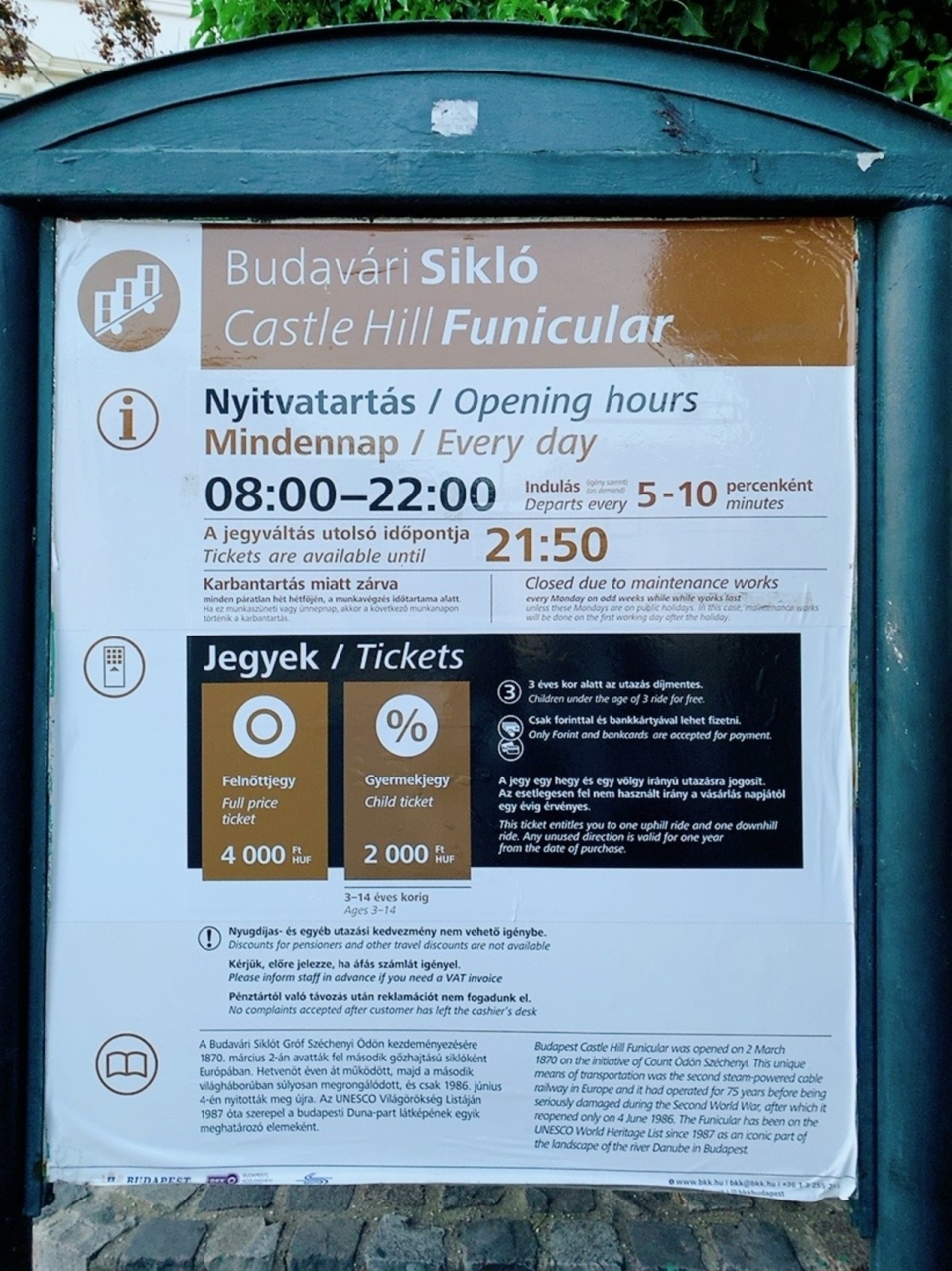 ブダペストを初めて訪れた時に利用したケーブルカーです。 所要時間たったの1-2分でブダの王宮のある丘に辿り着くことが出来ます。 ラクチンではあるけれど、値段はかなり高いです。 市内の交通機関の共通チケットも使えません。 ただ、観光客は話のネタに乗ってみるのも良いかと思います。