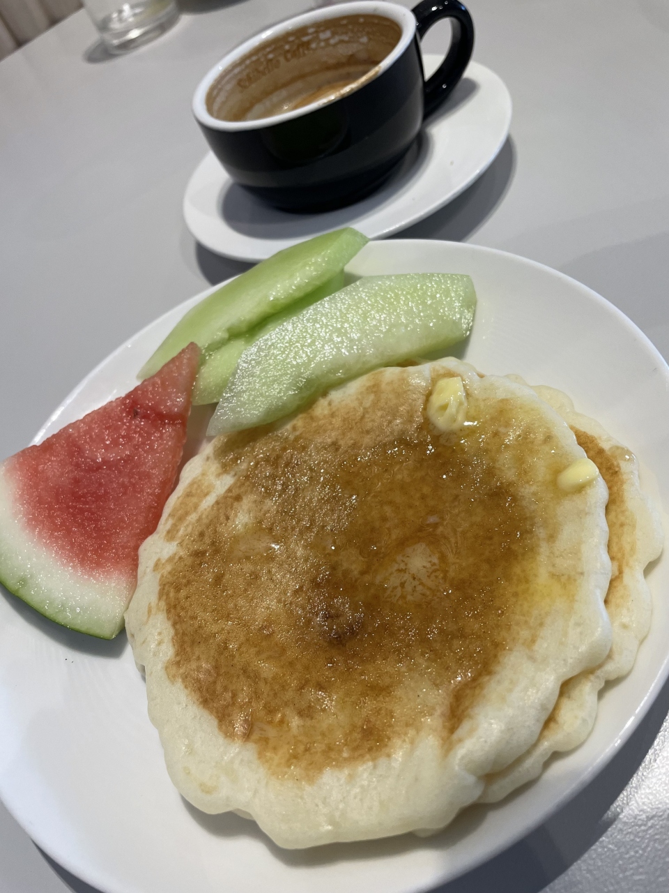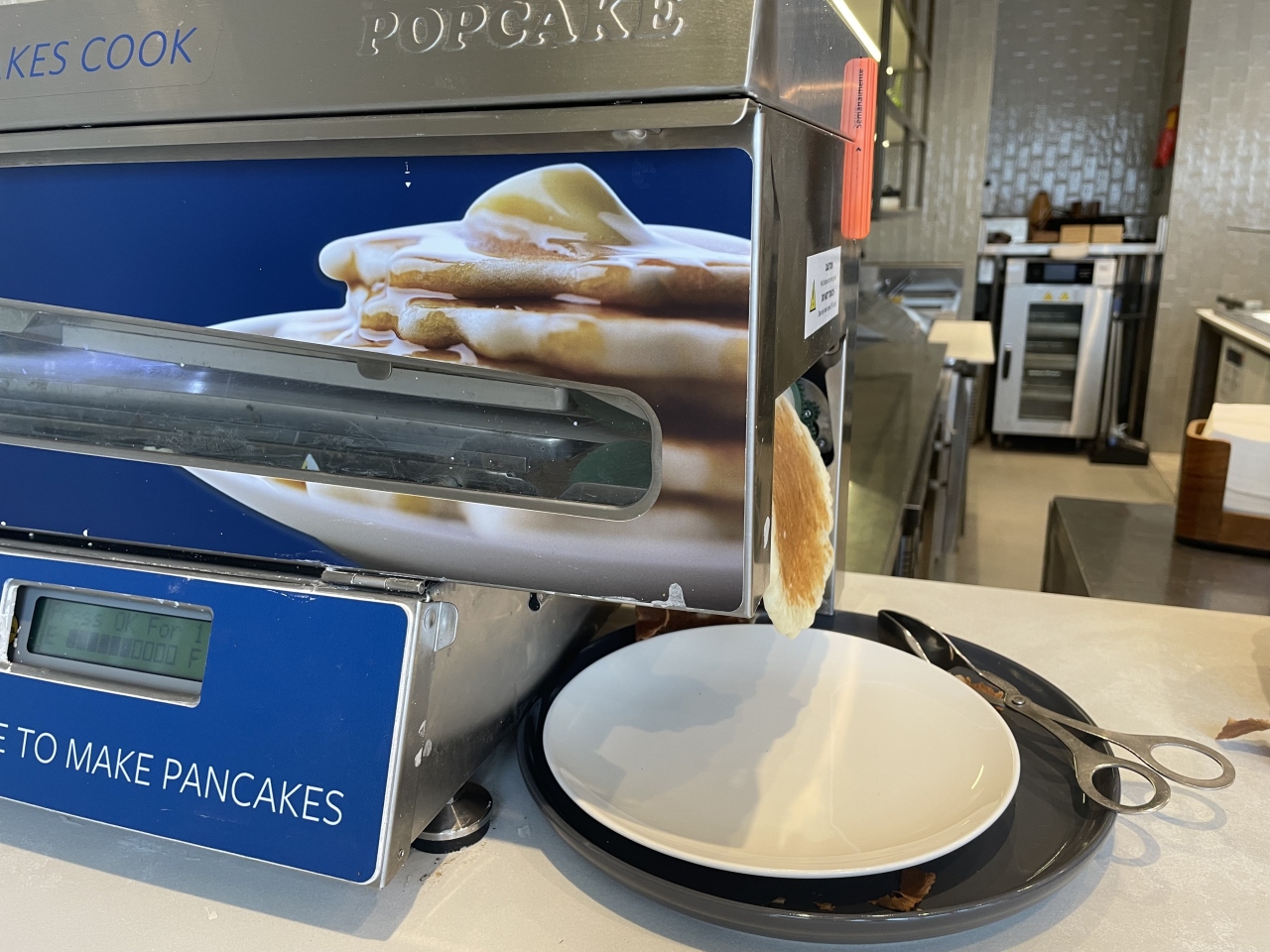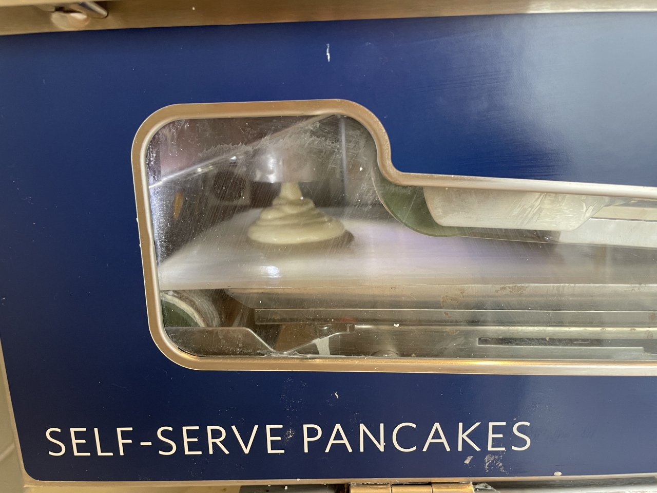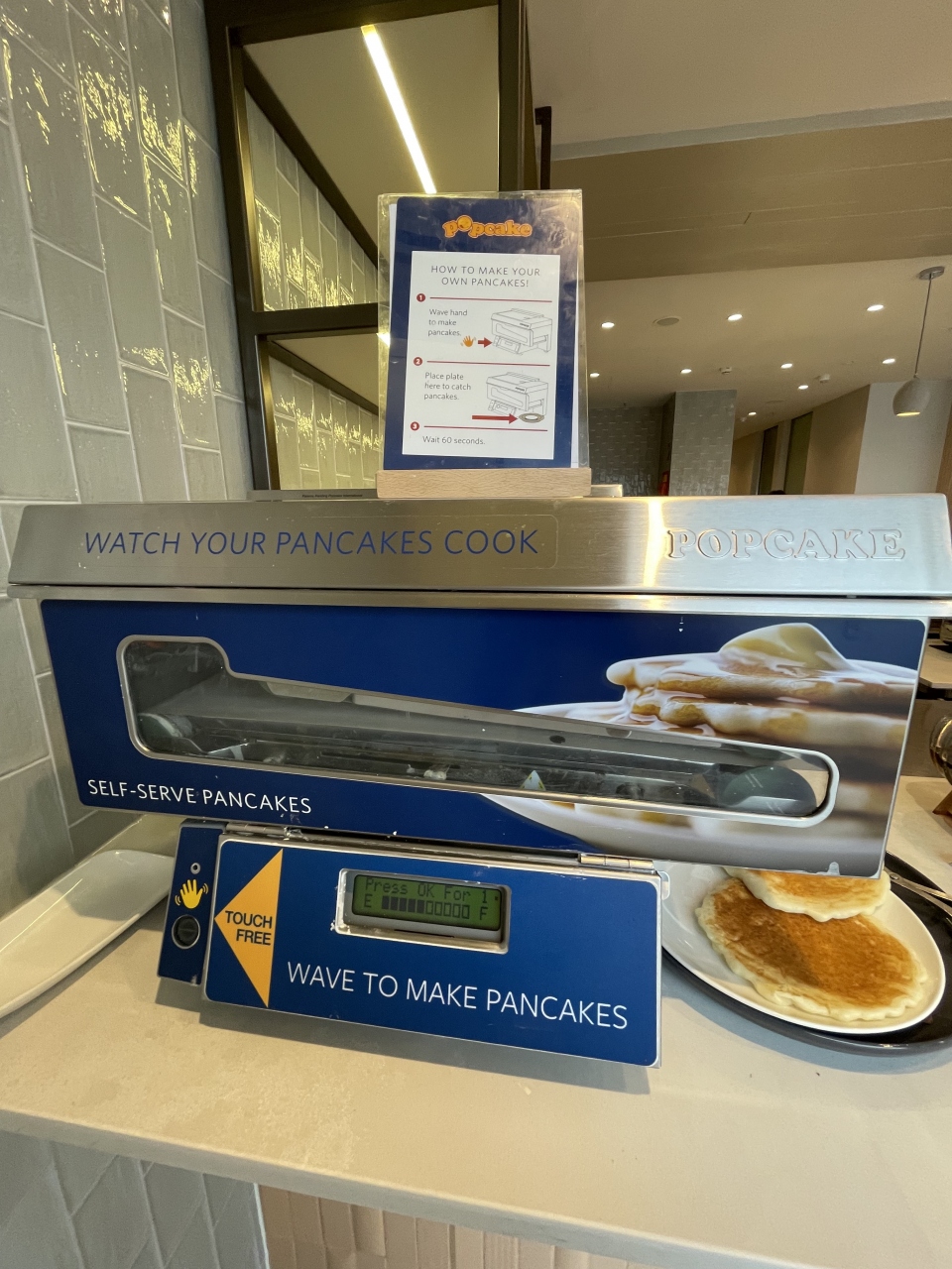 あまり広くなく、二人用の席をなんとか確保。朝食の時間帯なので品数は多くなかったです。自動のパンケーキマシンが面白かった。