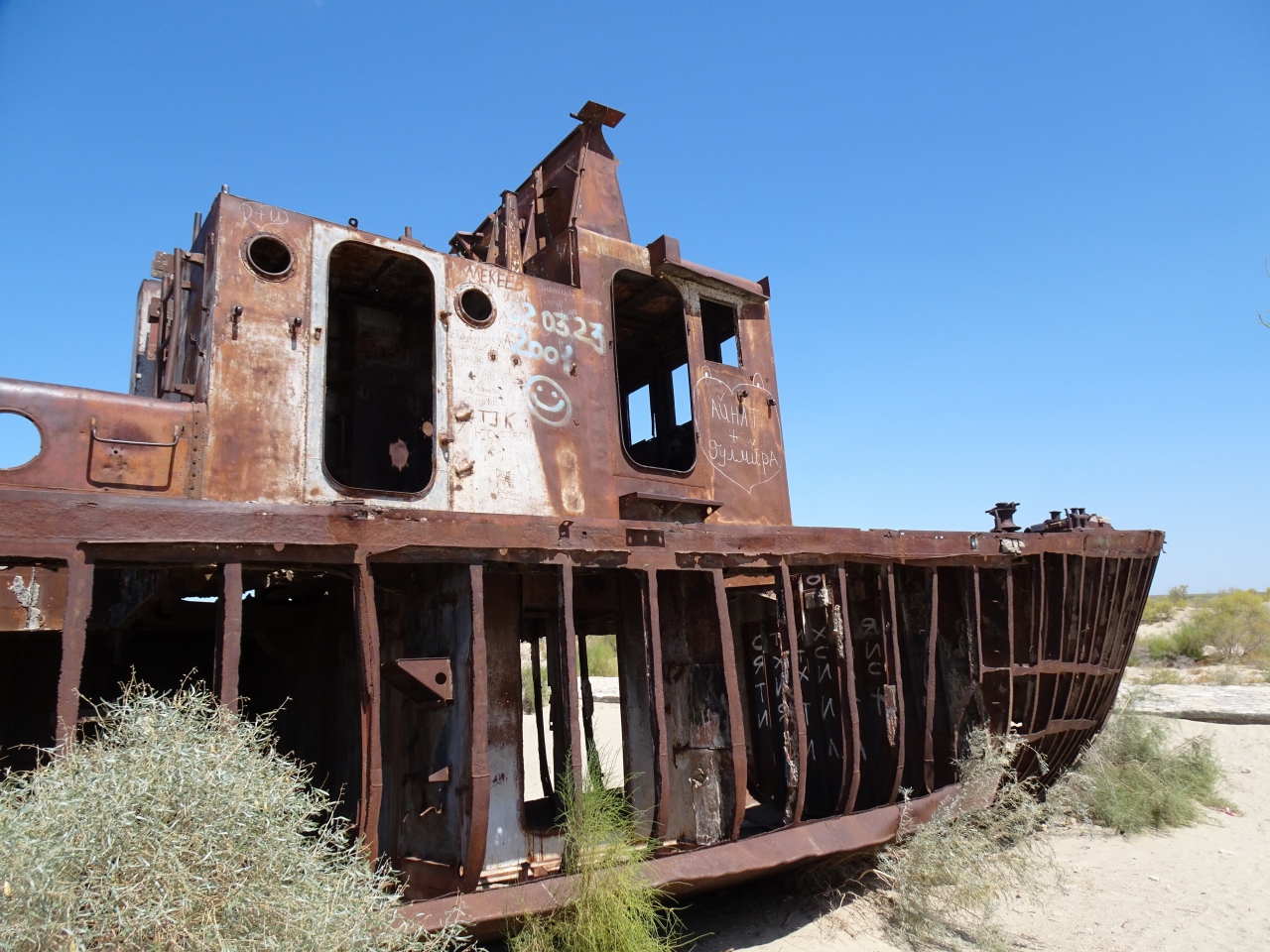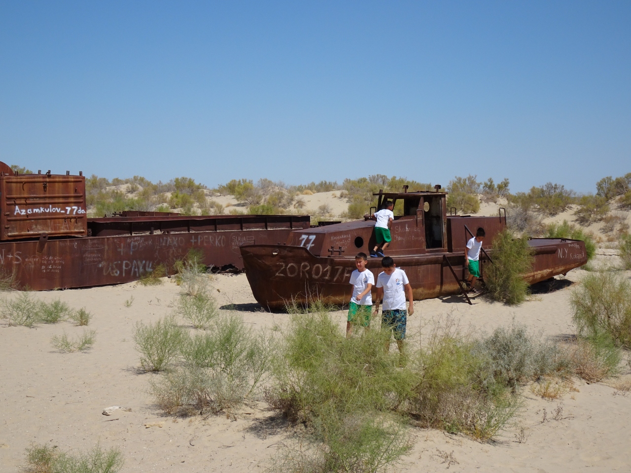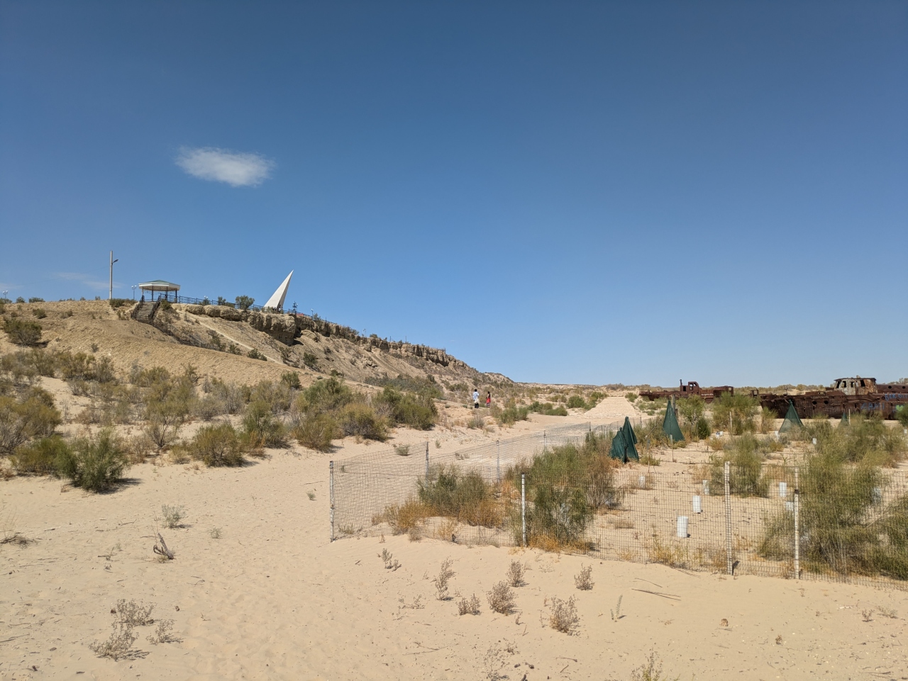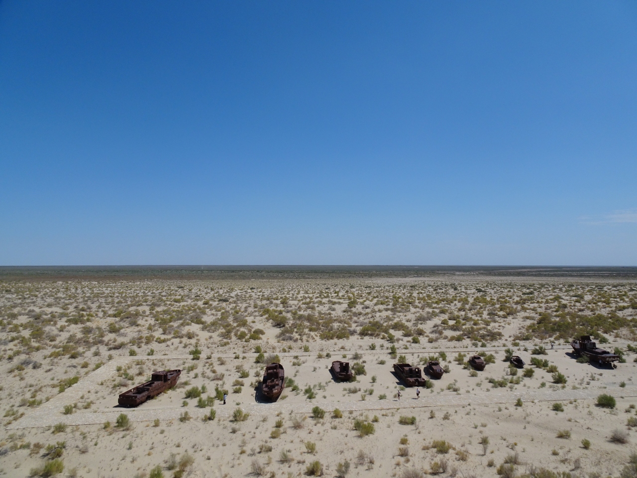 昔は湖岸(海岸?)だった高台に大きなモニュメントが建ち、その眼下にはだだっ広い荒野が広がっています。ほのかに植物も生えていますが、ほぼ砂漠のような状態です。そんな中に、そこに錆び切った漁船がいくつか鎮座しています。