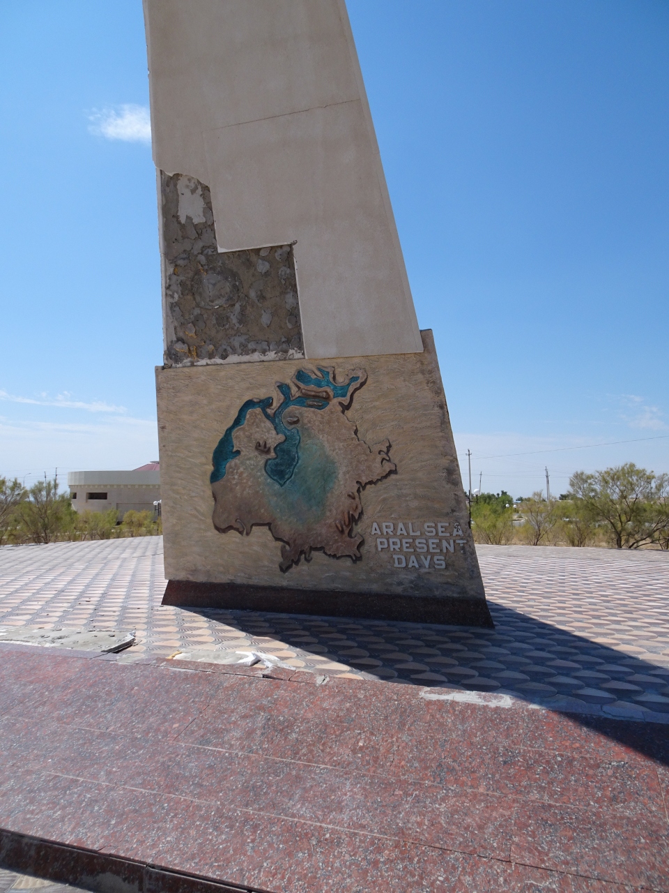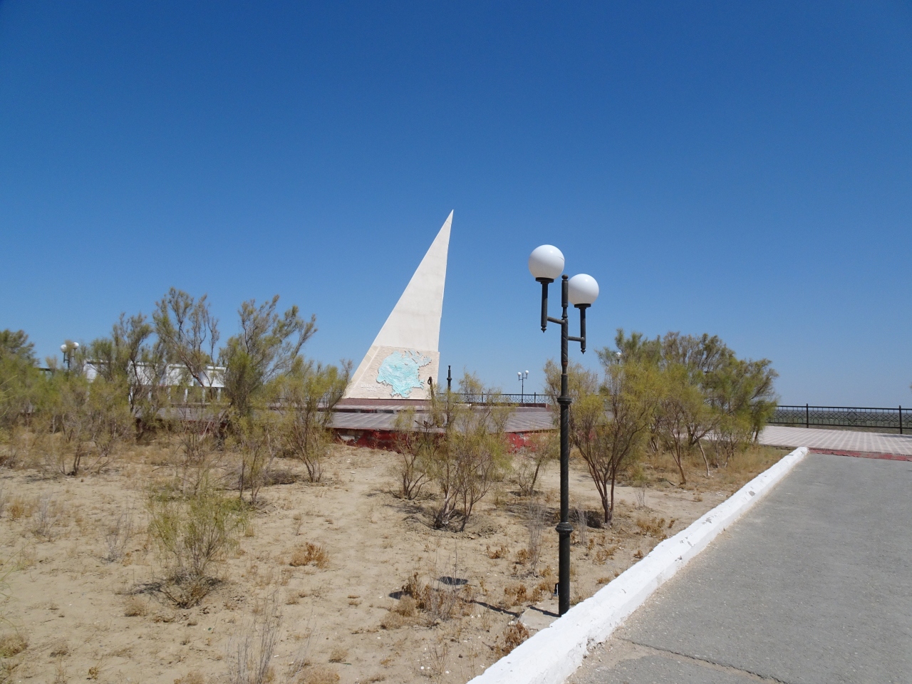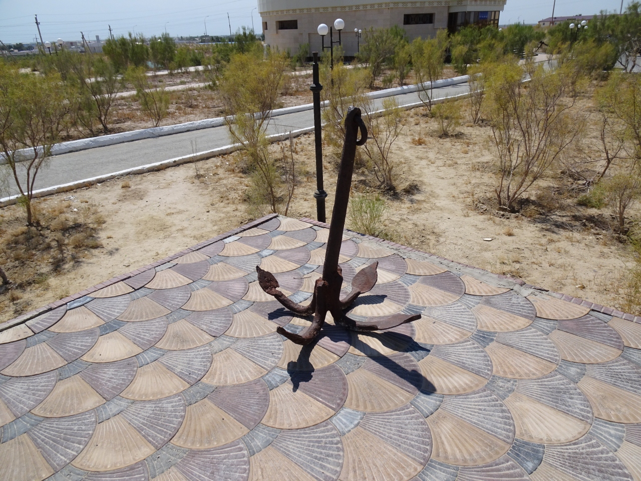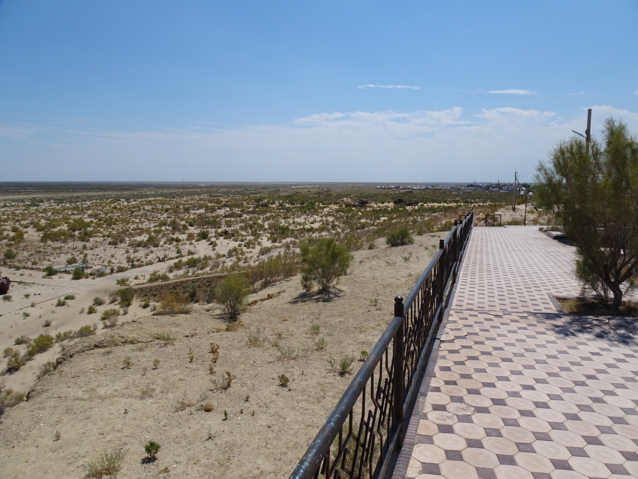 昔は湖岸(海岸?)だった高台に大きなモニュメントが建ち、その眼下にはだだっ広い荒野が広がっています。ほのかに植物も生えていますが、ほぼ砂漠のような状態です。そんな中に、そこに錆び切った漁船がいくつか鎮座しています。