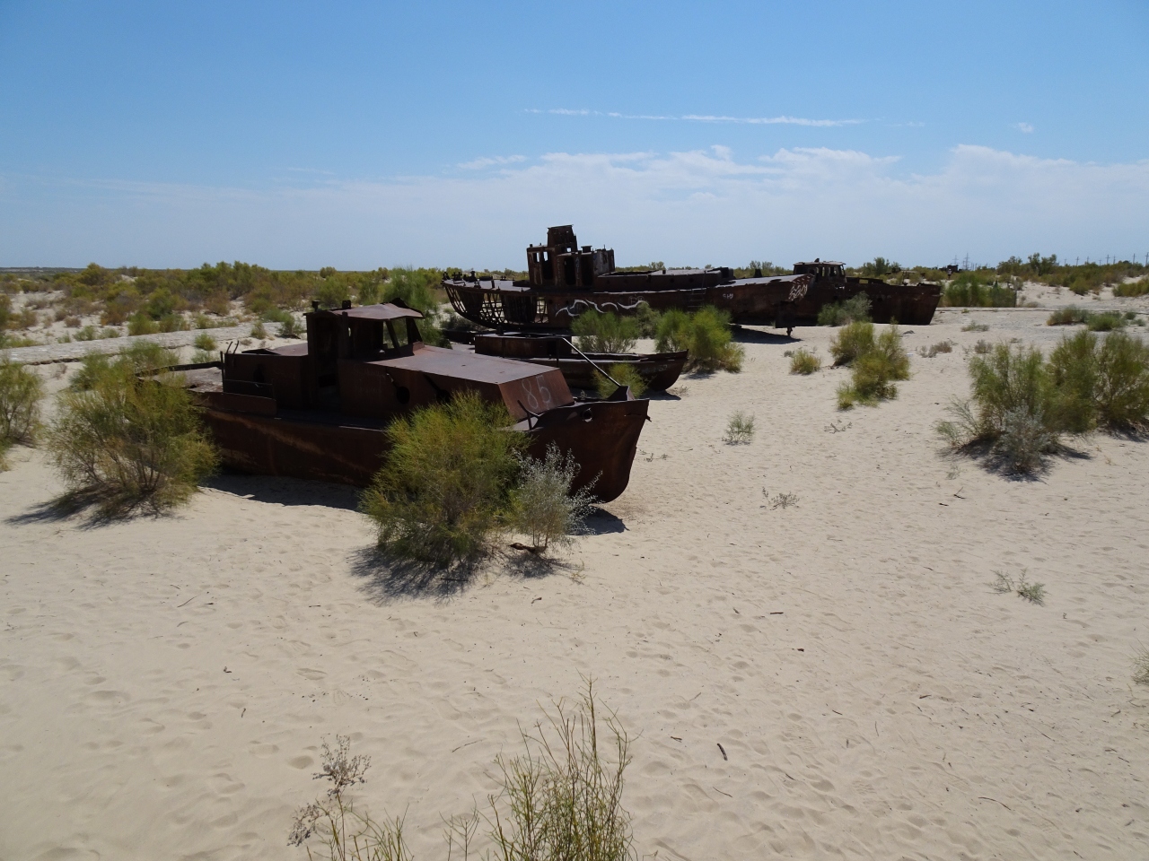 漁船のうち何台かは綺麗に横並びに置かれていて、その周りには縁石が敷かれていていました。もともと整然と並んでいた船がそのままアラル海から取り残されてこうなったのか、適当に転がっていた船を観光用に運び直したのかは不明ですが、想像していたよりはある程度見栄え良く展示されている印象を受けました。