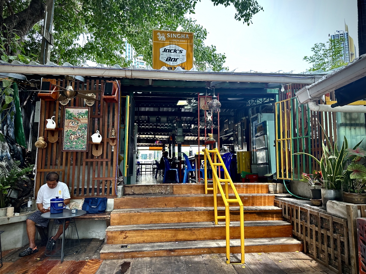 シャングリラホテルの真ん前の小道を進んで行くと...チャオプラヤー川にはみ出した掘立て小屋がここ!(Jack's Bar/BTSサパーンタクシン駅/バンコク)